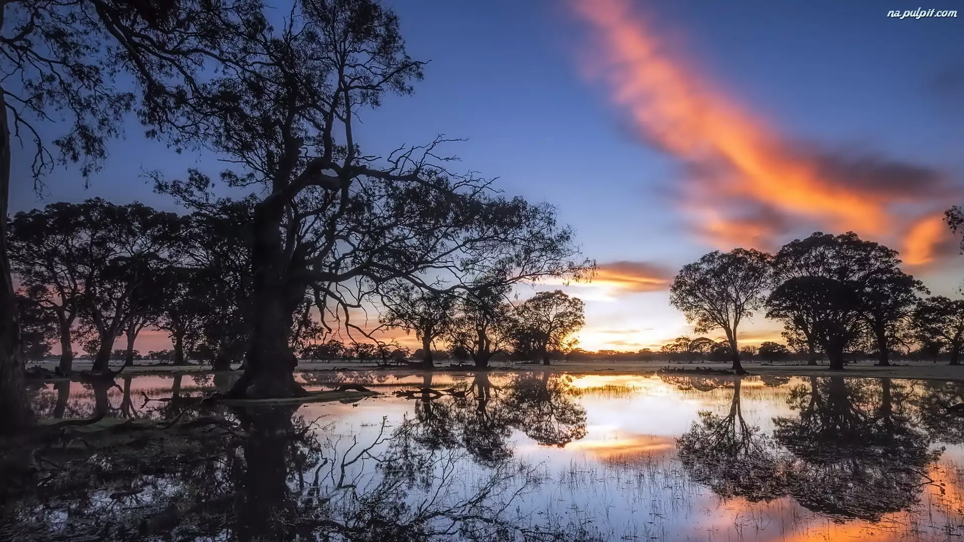 Zachód, Coonawarra, Odbicie, Drzewa, Słońca, Staw, Australia