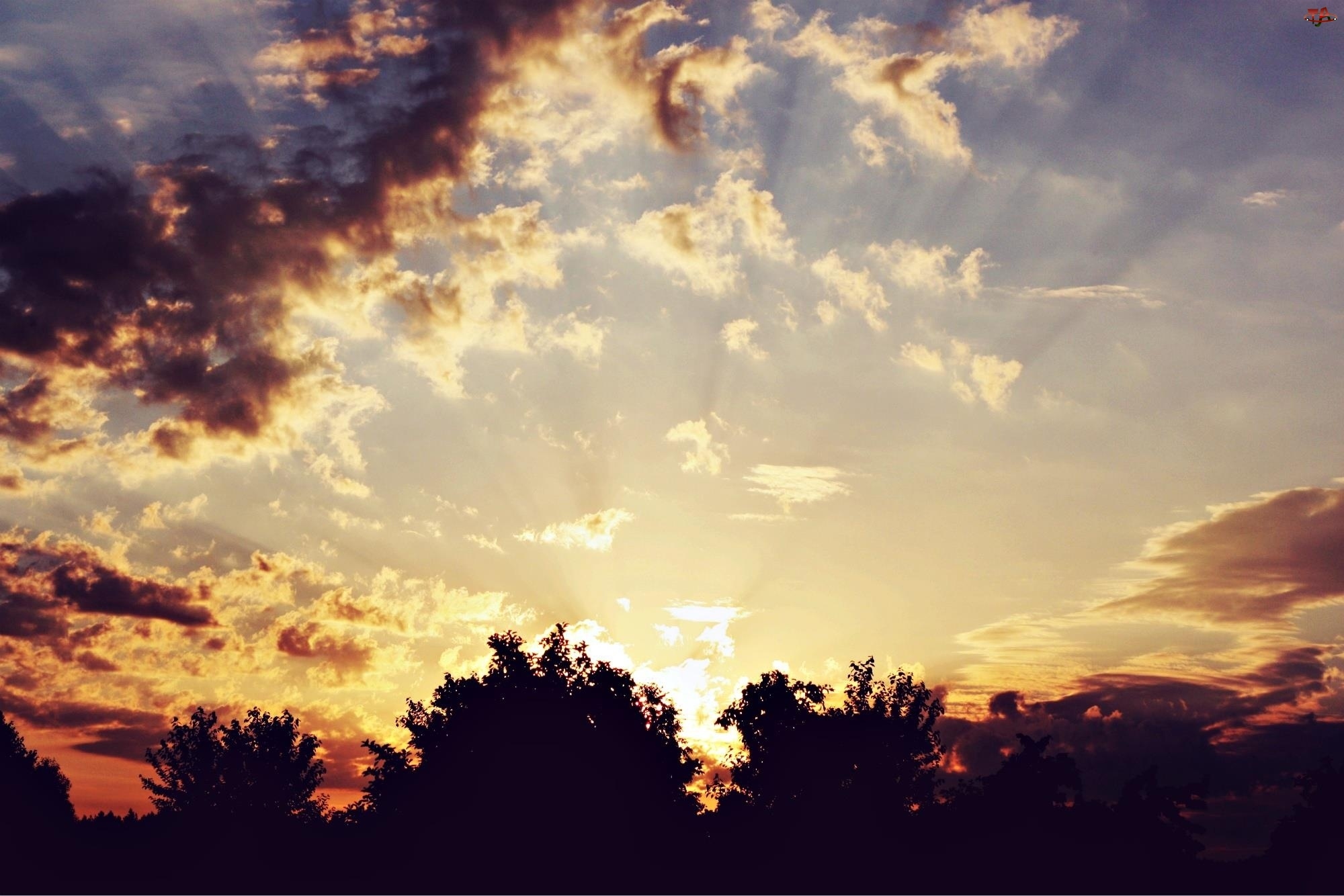 Zachód, Drzewa, Słońca, Niebo