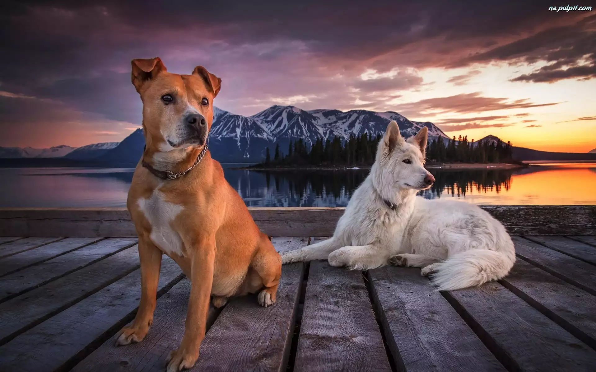 Zachód, Pomost, Wyspa, Jezioro, Słońca, Góry, Psy