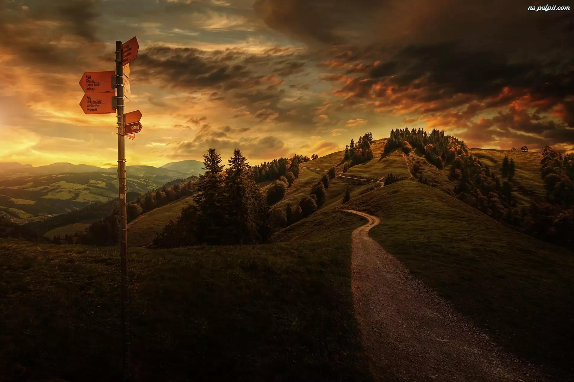 Zachód Słońca, Góry, Drogowskaz, Ścieżka, Chmury