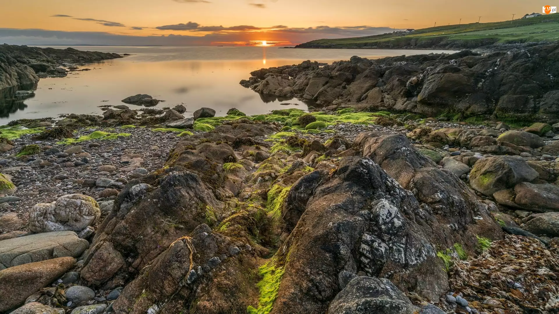 Osada Skaw, Morze Północne, Szetlandy, Wschód słońca, Szkocja, Skały, Wyspa Whalsay, Kamienie