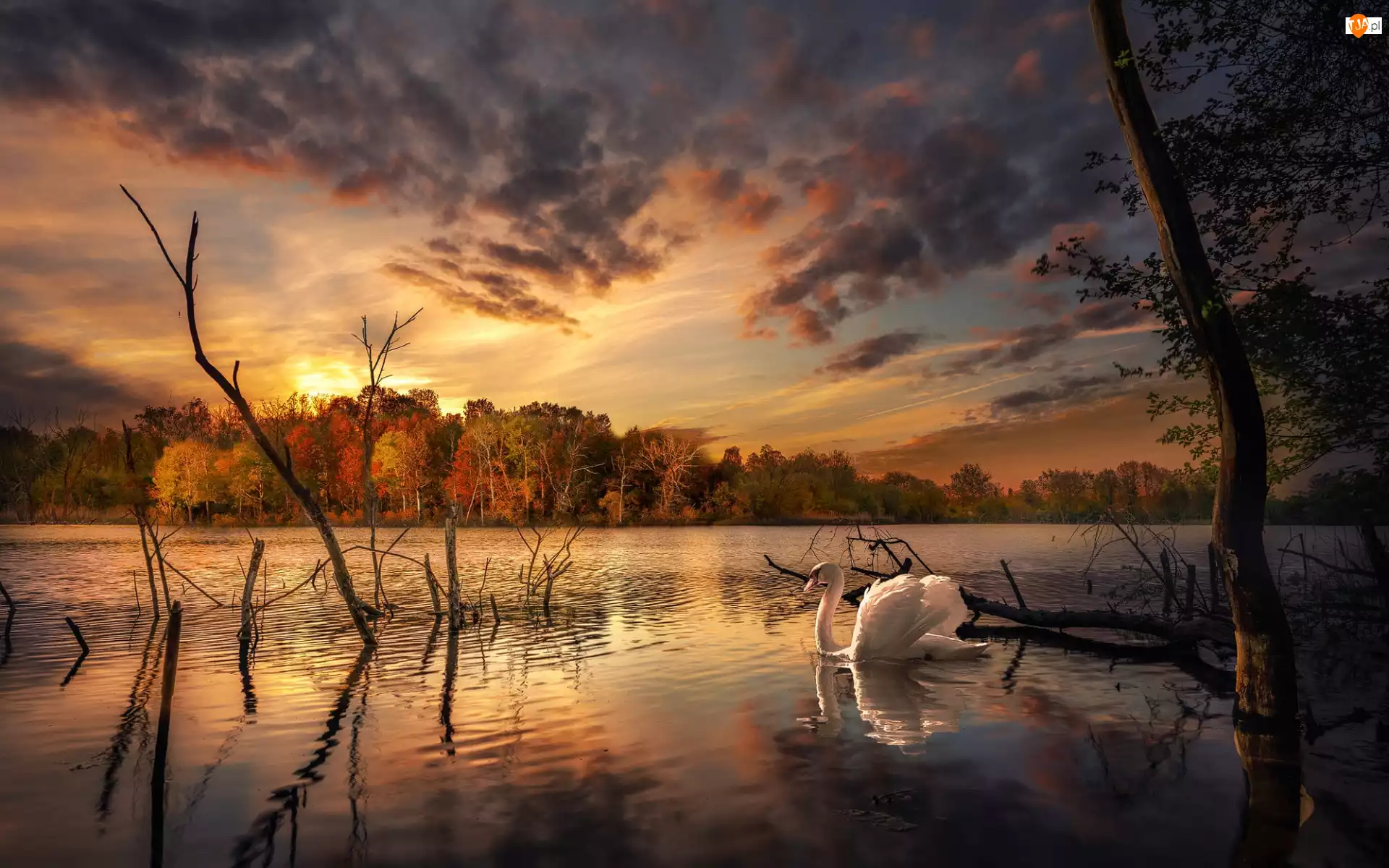 Zachód słońca, Jezioro, Chmury, Jesień, Łabędż, Las, Drzewa