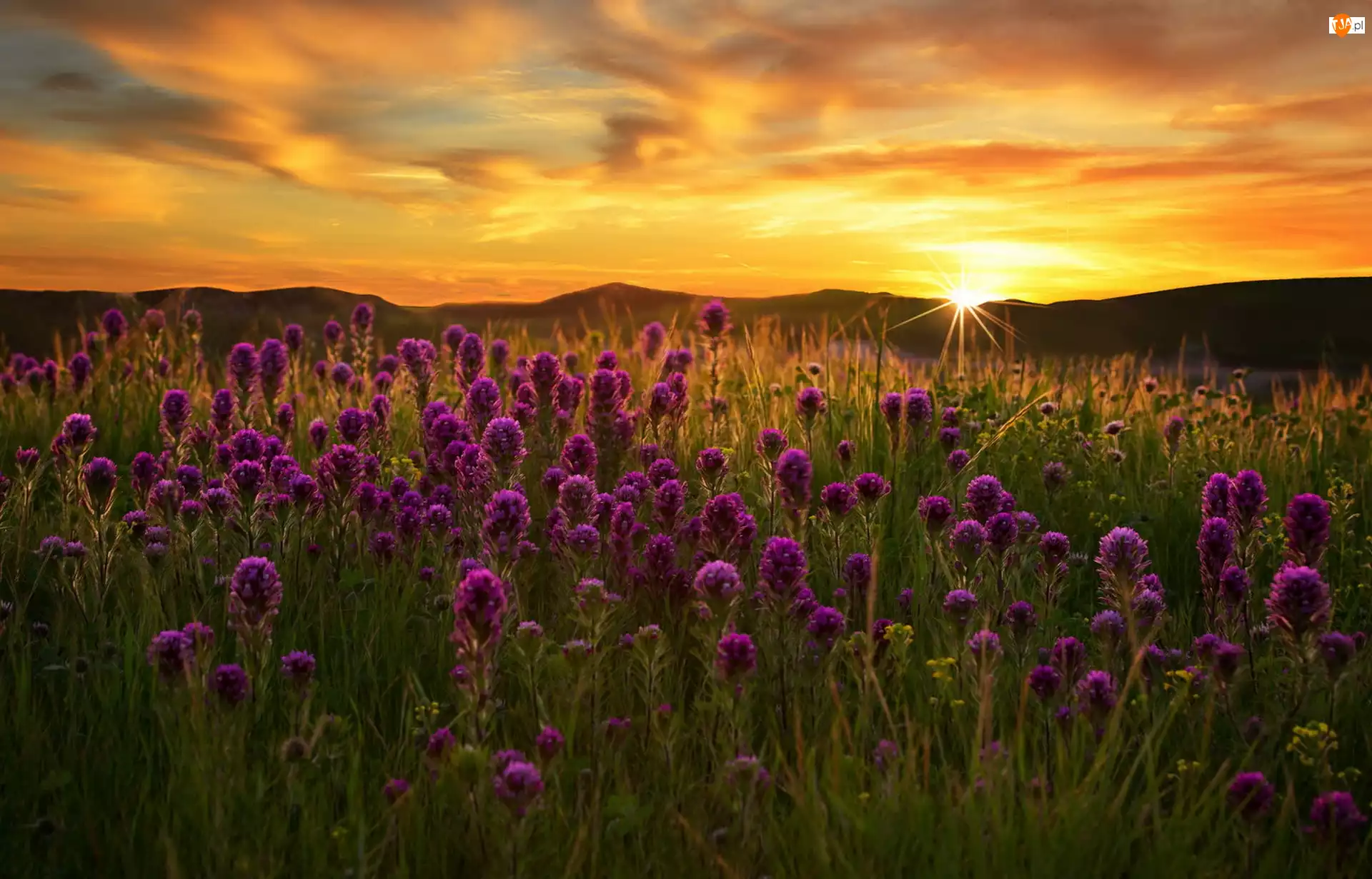 Zachód słońca, Łąka, kwiaty