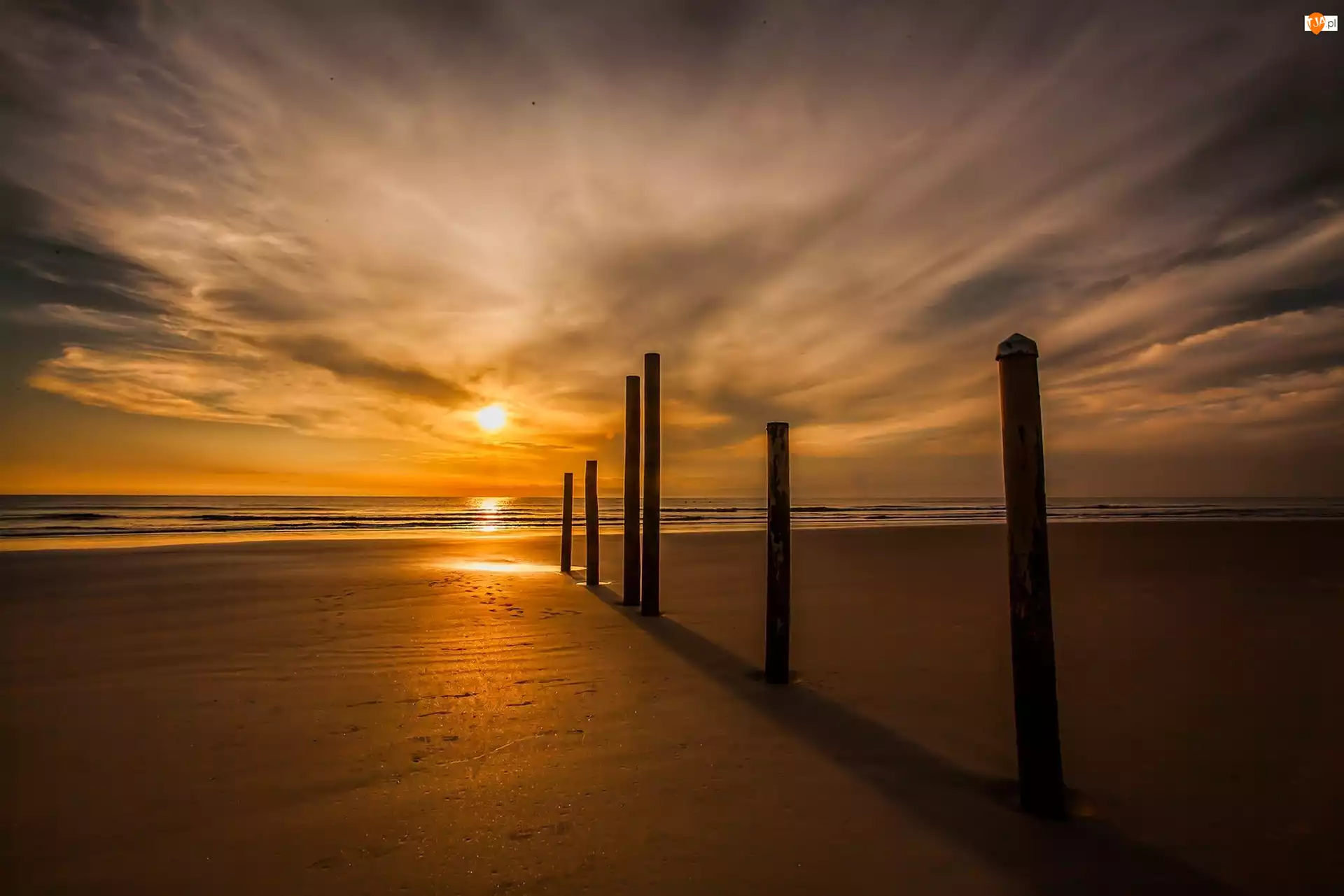 Zachód Słońca, Morze, Drewniane, Plaża, Pale