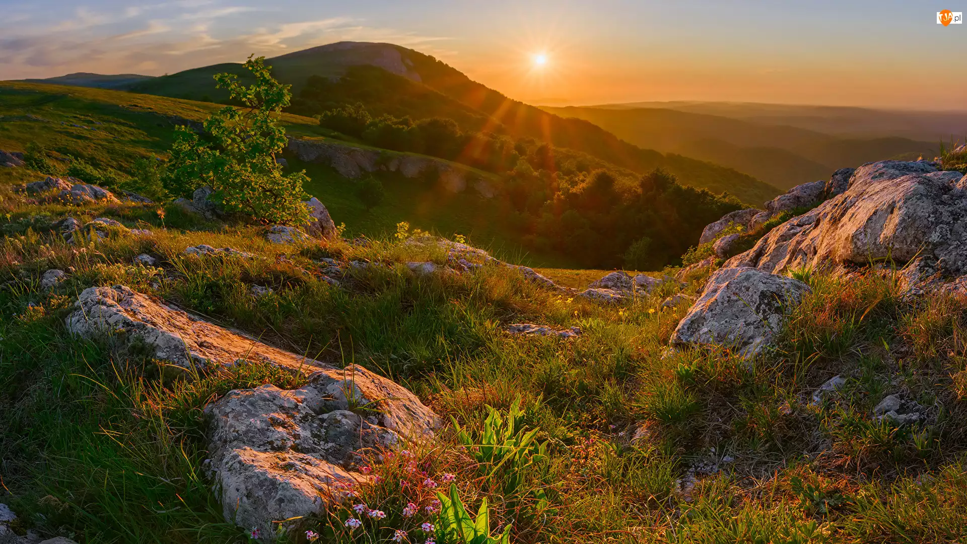 Góry, Wzgórza, Trawa, Promienie słońca, Skały, Rośliny