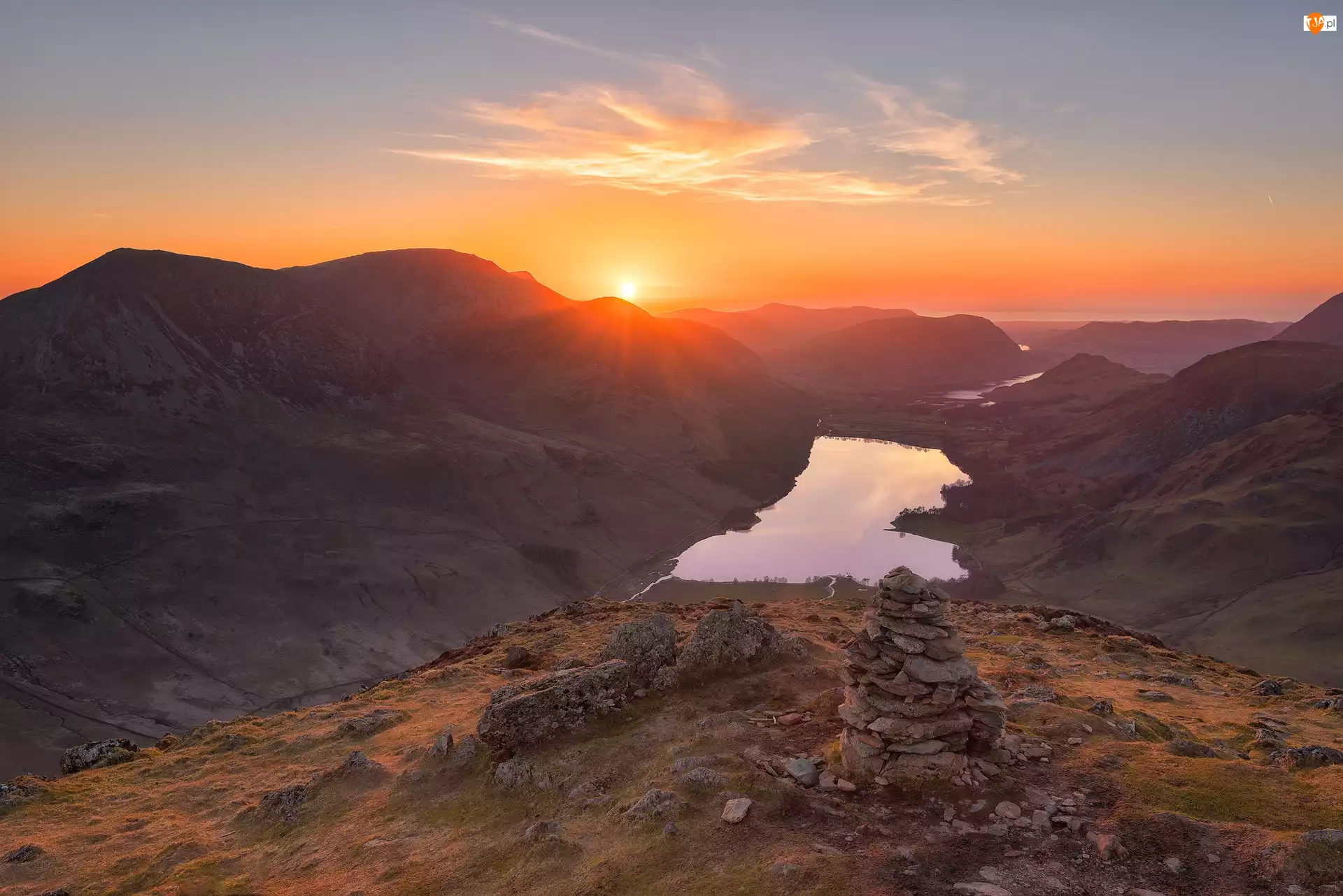 Zachód słońca, Anglia, Jezioro Buttermere, Góry, Hrabstwo Kumbria