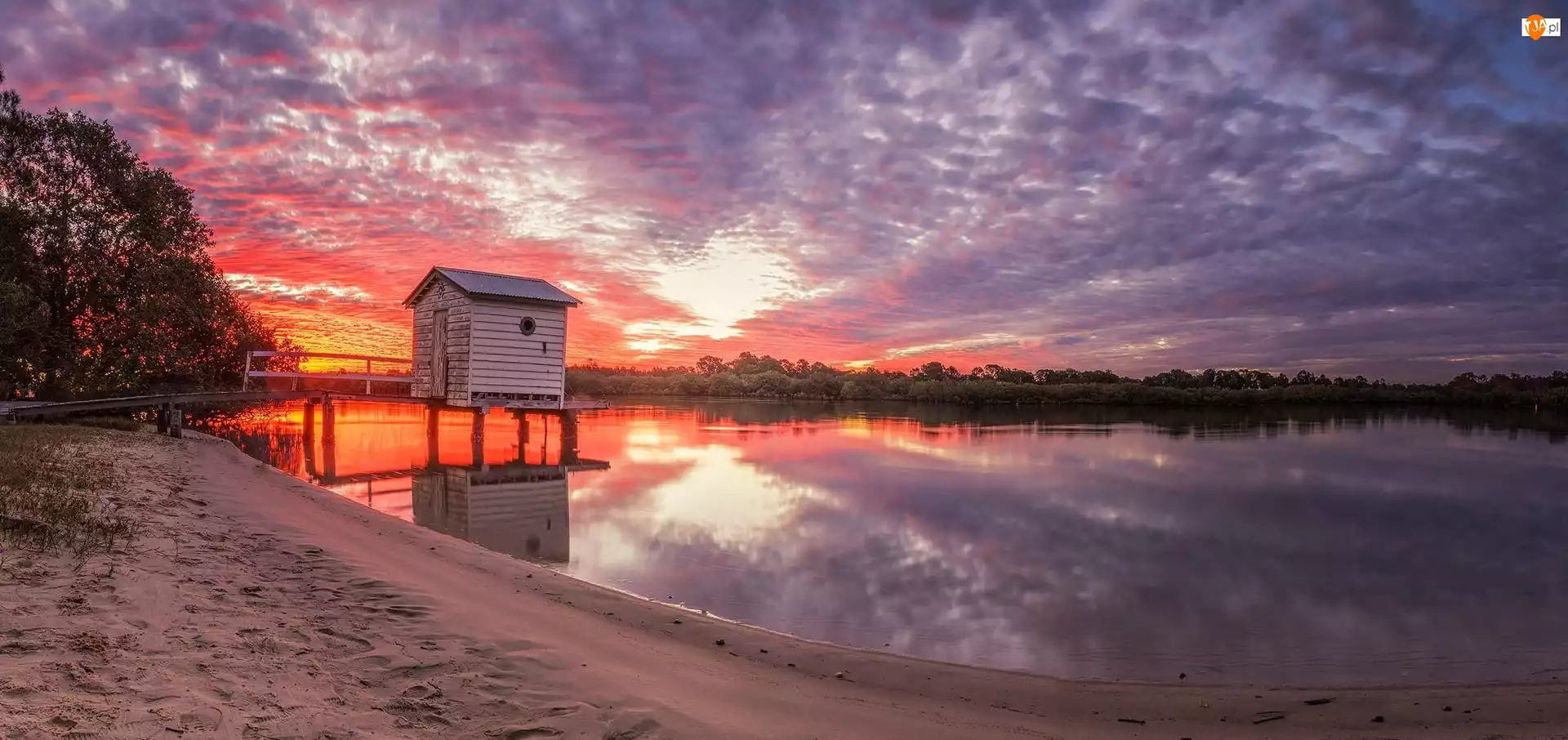 Pomost, Jezioro, Drzewa, Zachód słońca, Domek