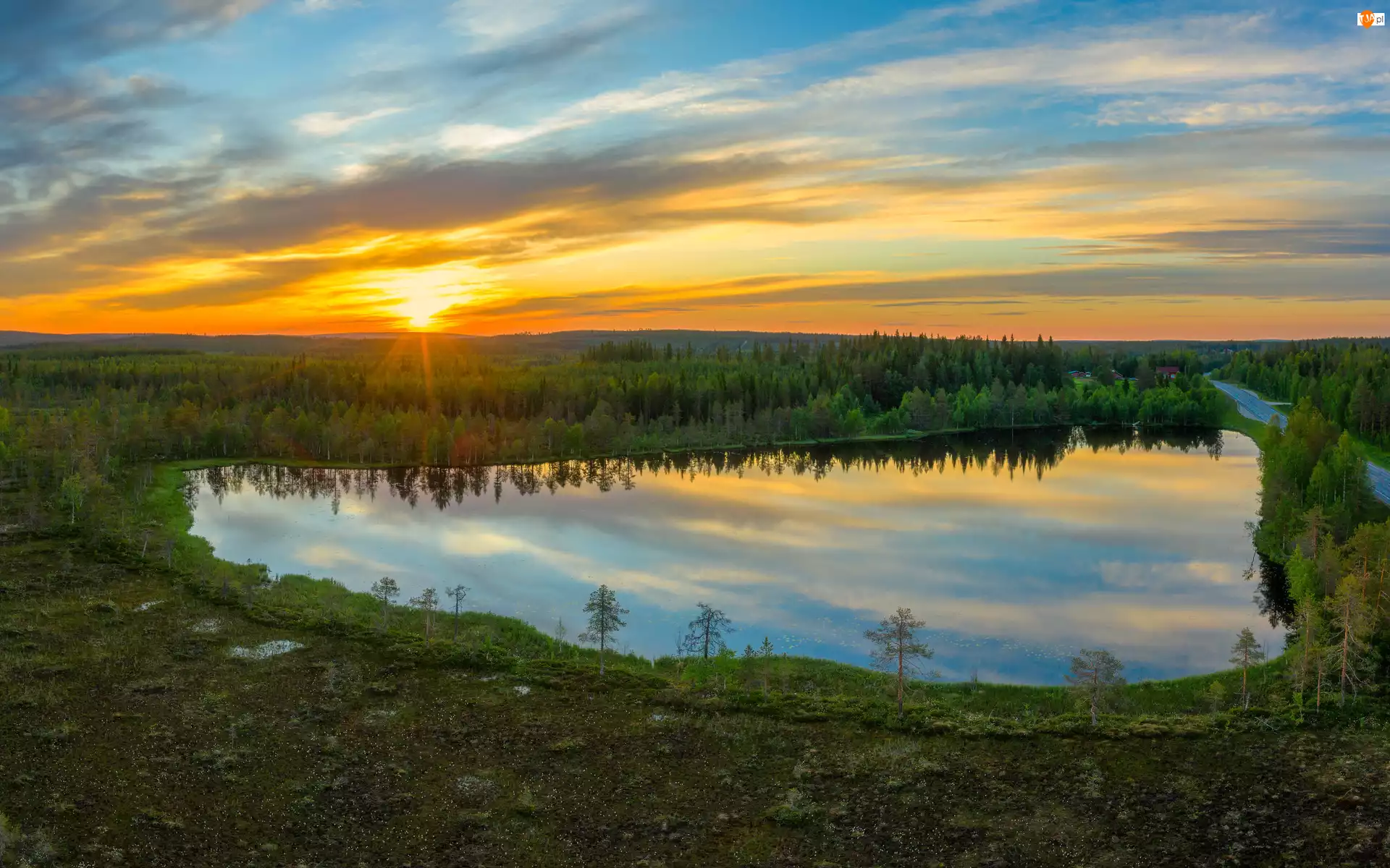 Zachód słońca, Jezioro, Lasy, Droga