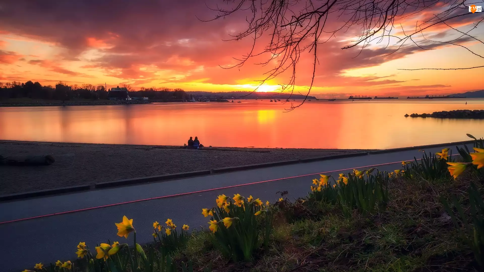 Narcyzy żonkile, Jezioro, Zachód słońca, Droga