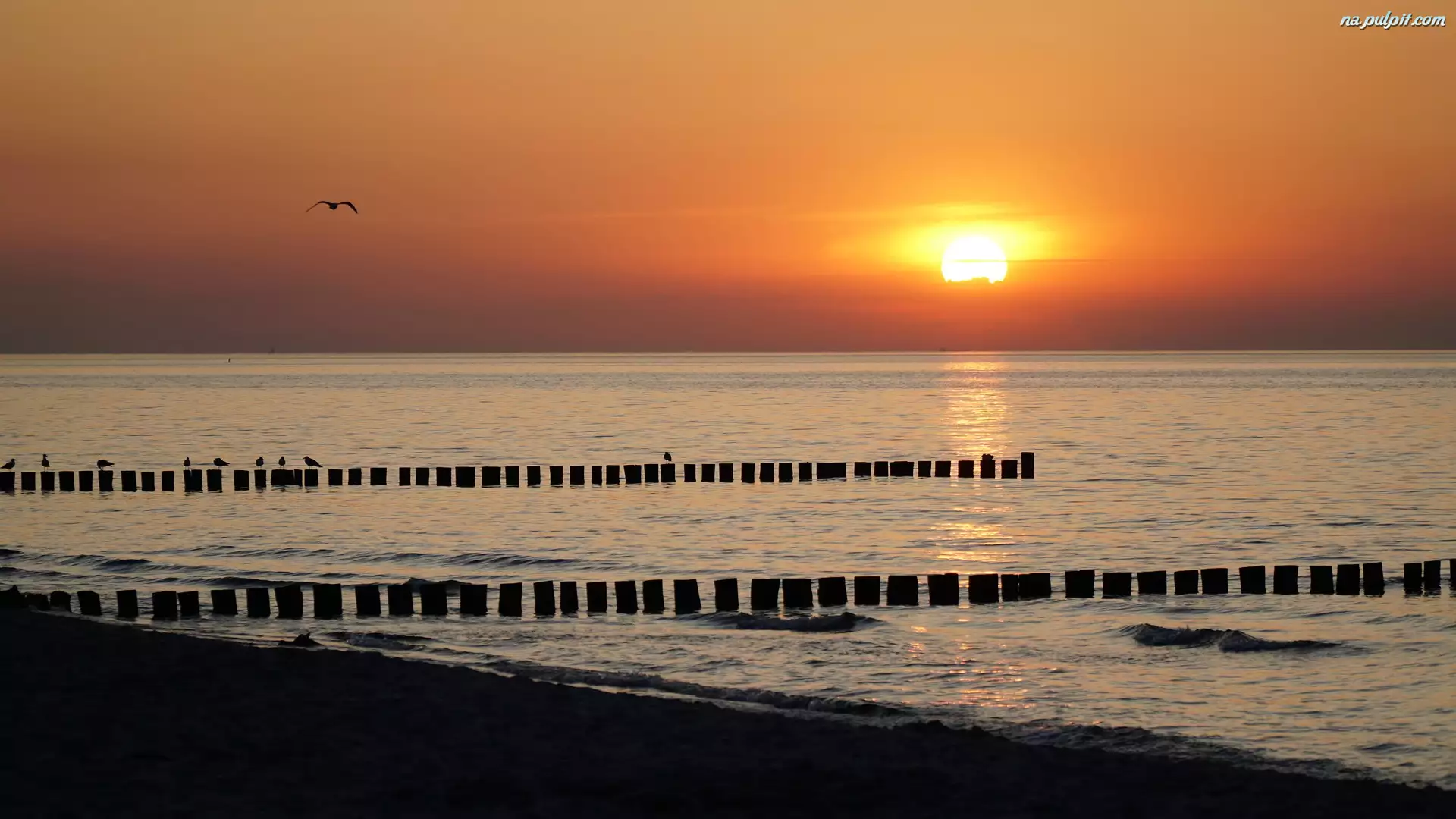 Ptaki, Zachód słońca, Morze, Pale