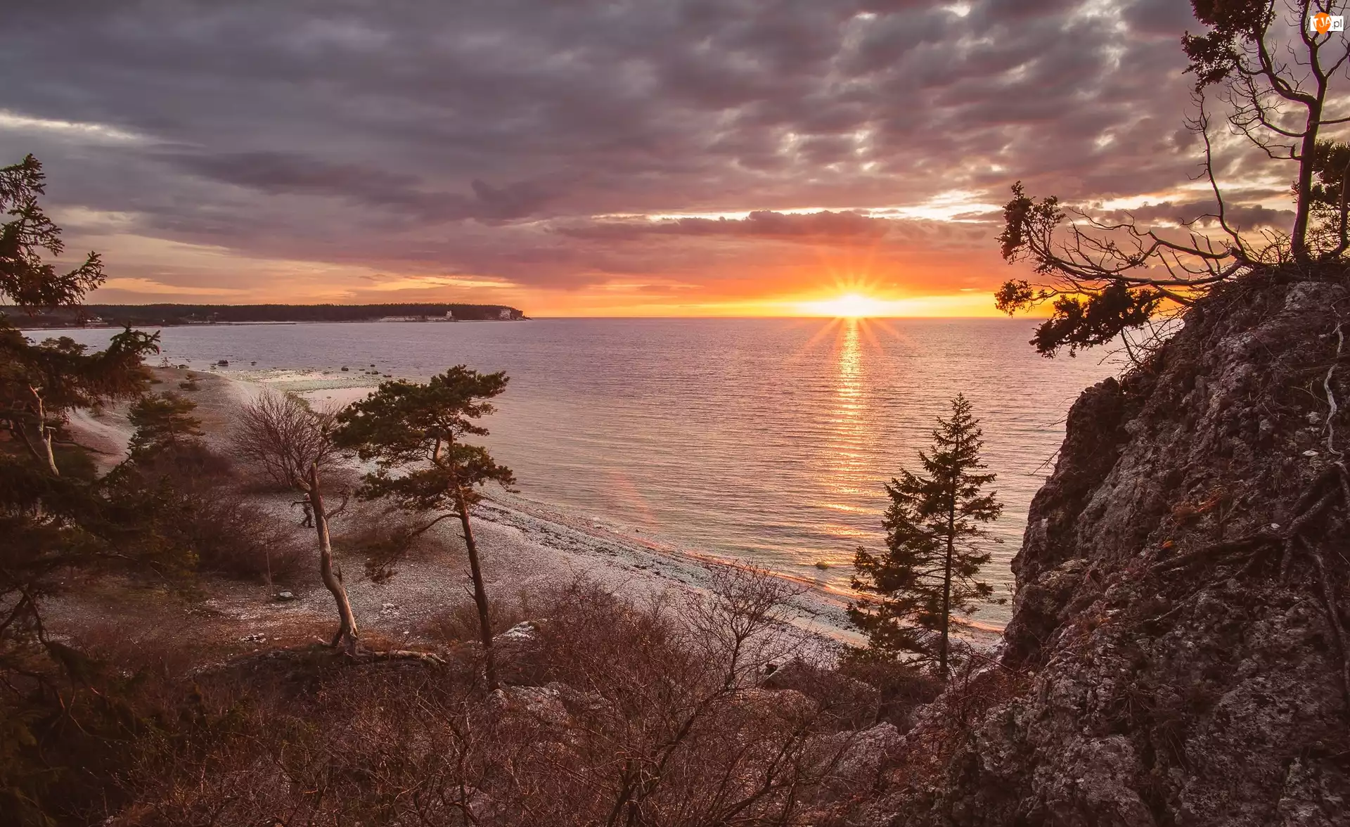 Chmury, Wybrzeże, Drzewa, Skały, Zachód słońca