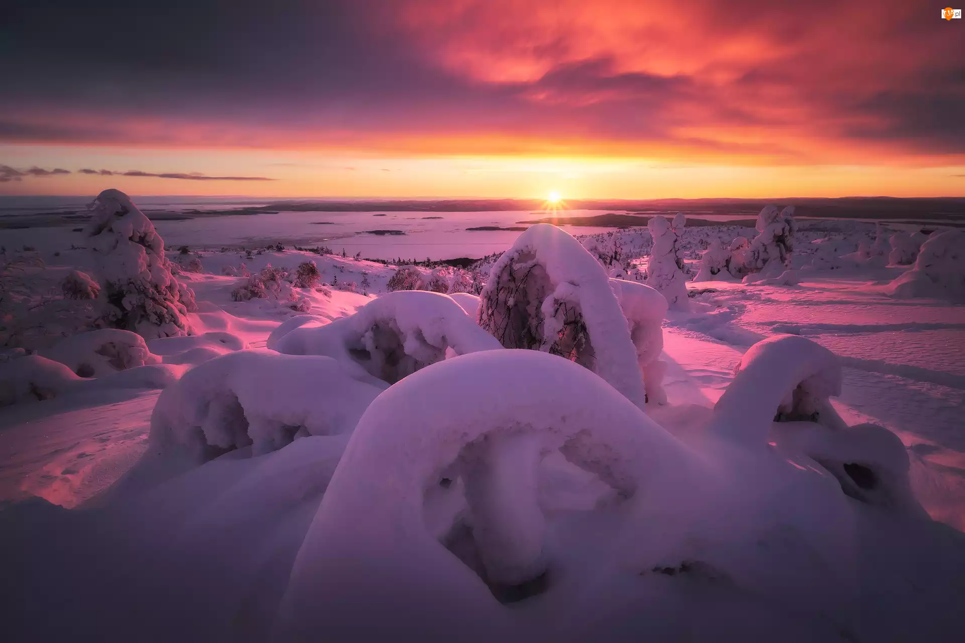 Zaśnieżone, Drzewa, Rosja, Zima, Półwysep Kolski, Zatoka Kandałaksza, Zachód słońca