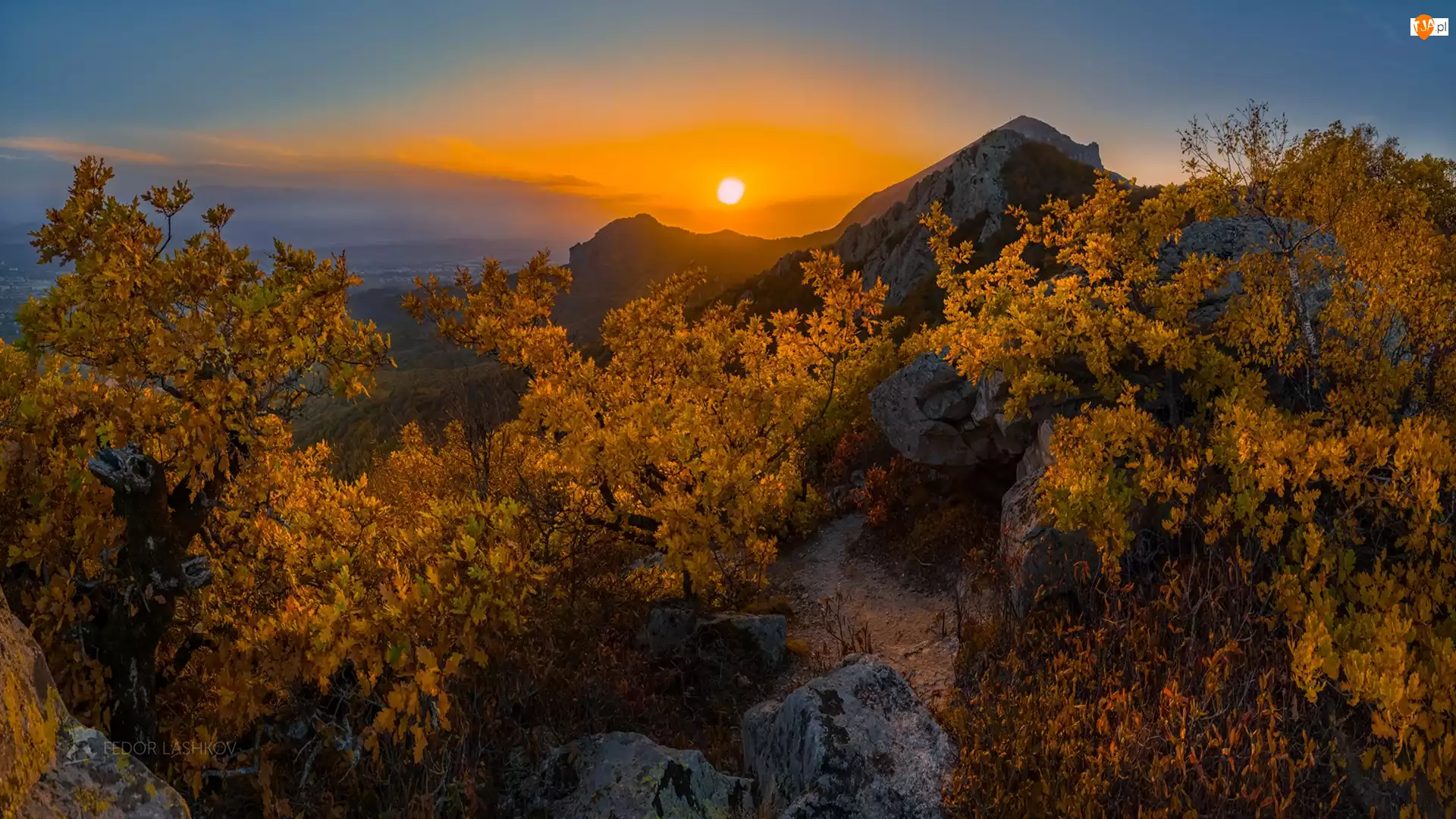 Skały, Drzewa, Rosja, Góry Mount Beshtau, Kraj Stawropolski, Zachód słońca, Krzewy