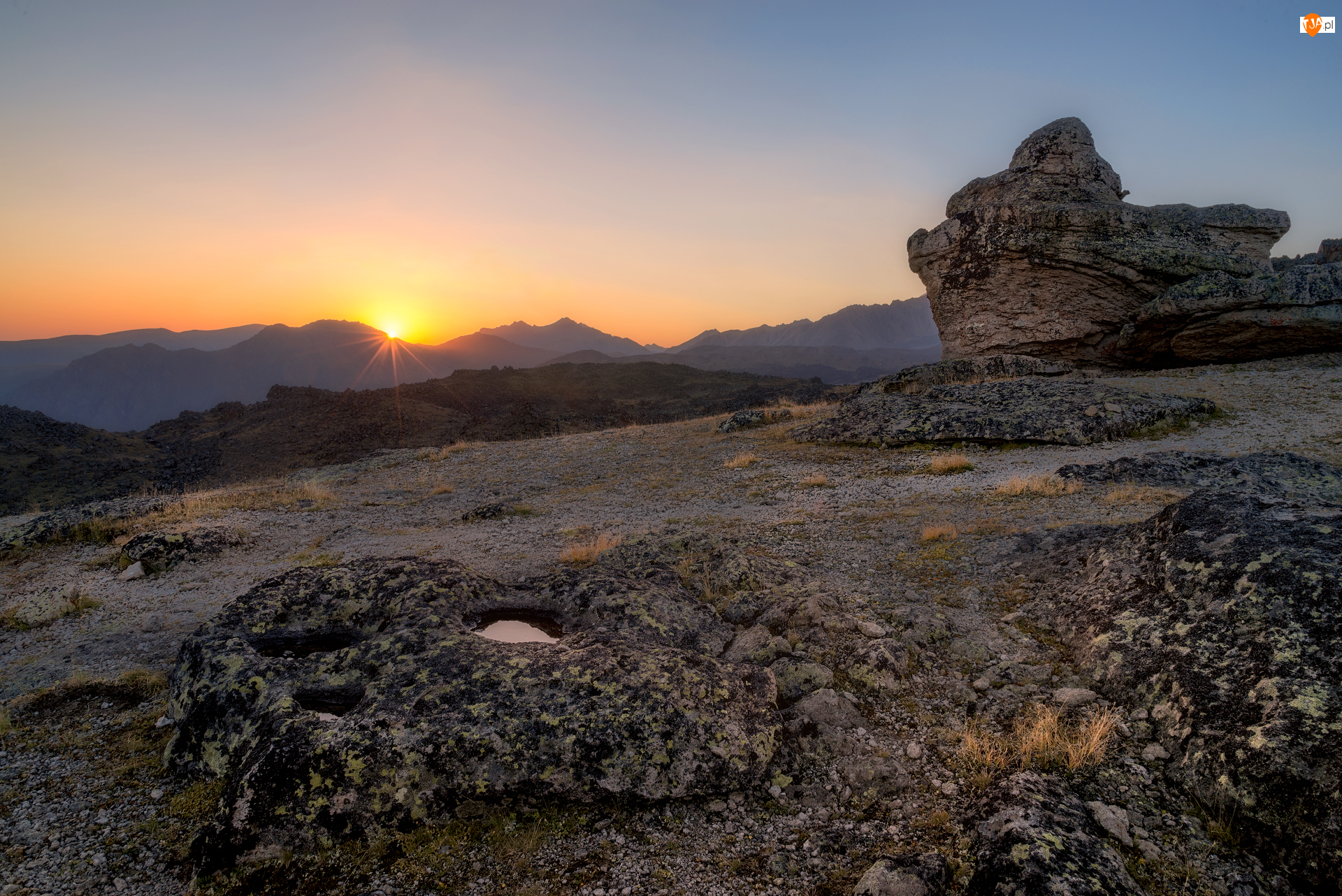 Góry, Zachód słońca, Małe, Trawy, Skały, Kępki