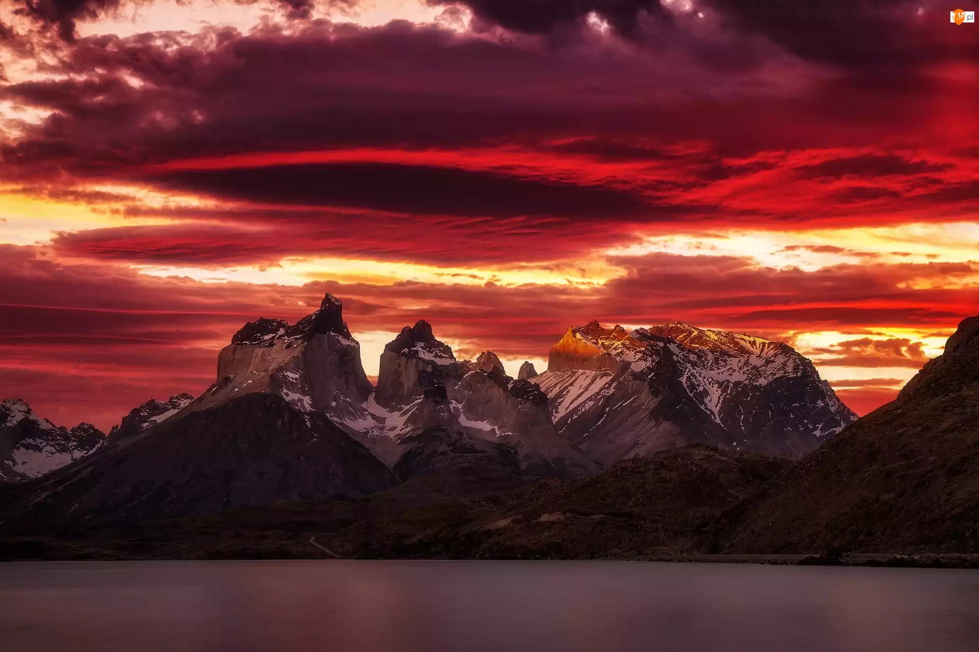 Zachód słońca, Góry, Jezioro, Zachód Słońca, Patagonia, Chile, Cordillera del Paine, Park Narodowy Torres del Paine, Jezioro Lake Pehoé, Chmury