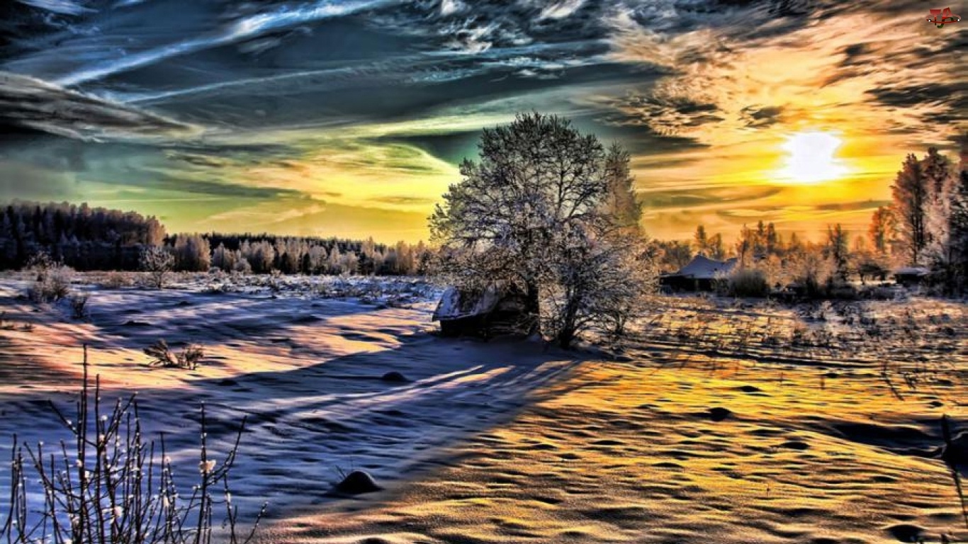 Zachód Słońca, Zima, Niebo, Kolorowe, Chmury