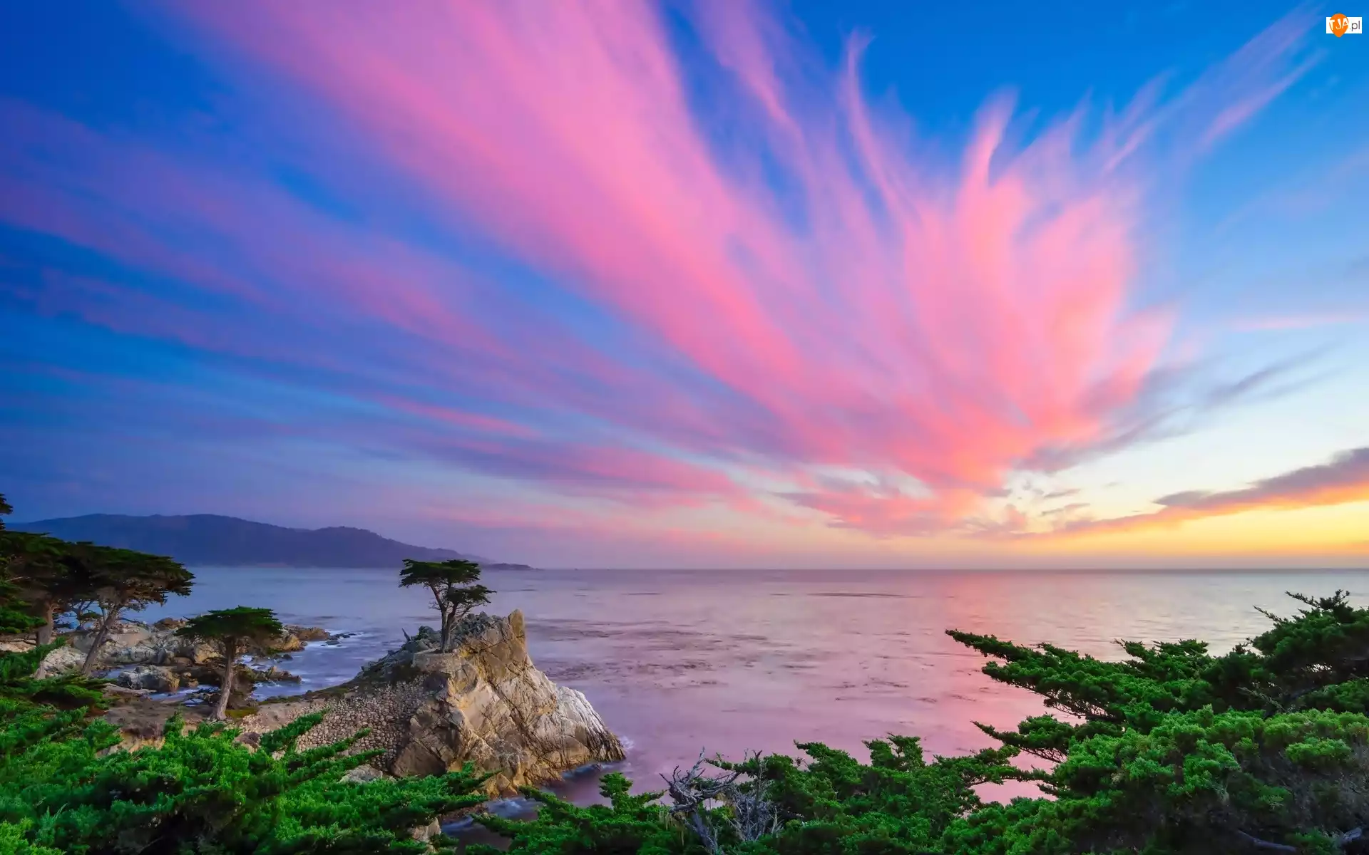 Zachód, Wybrzeże, Cyprys, Samotny, Słońca, Skała, Kalifornii