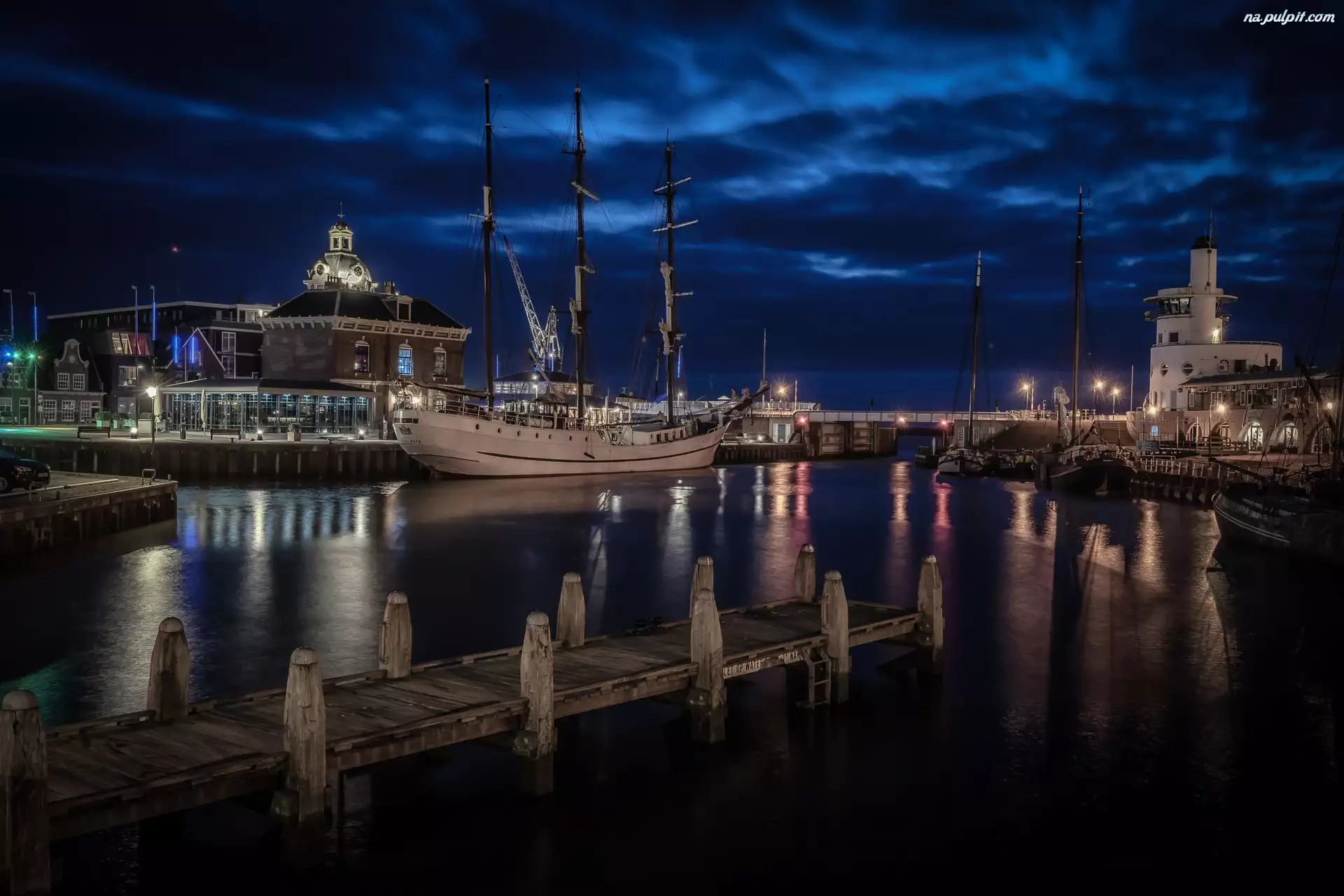 Harlingen, Nabrzeże, Drewniany, Noc, Port, Pomost, Holandia, Żaglowiec