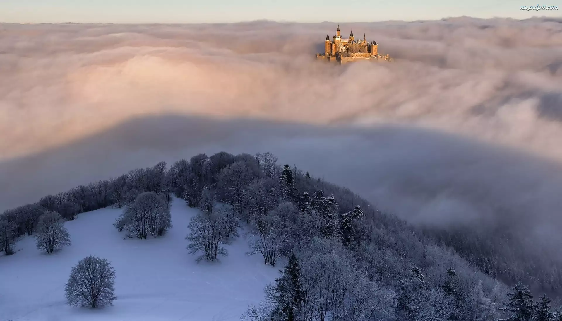 Drzewa, Badenia-Wirtembergia, Oszronione, Mgła, Góra, Góra Hohenzollern, Zamek Hohenzollern, Niemcy, Zima