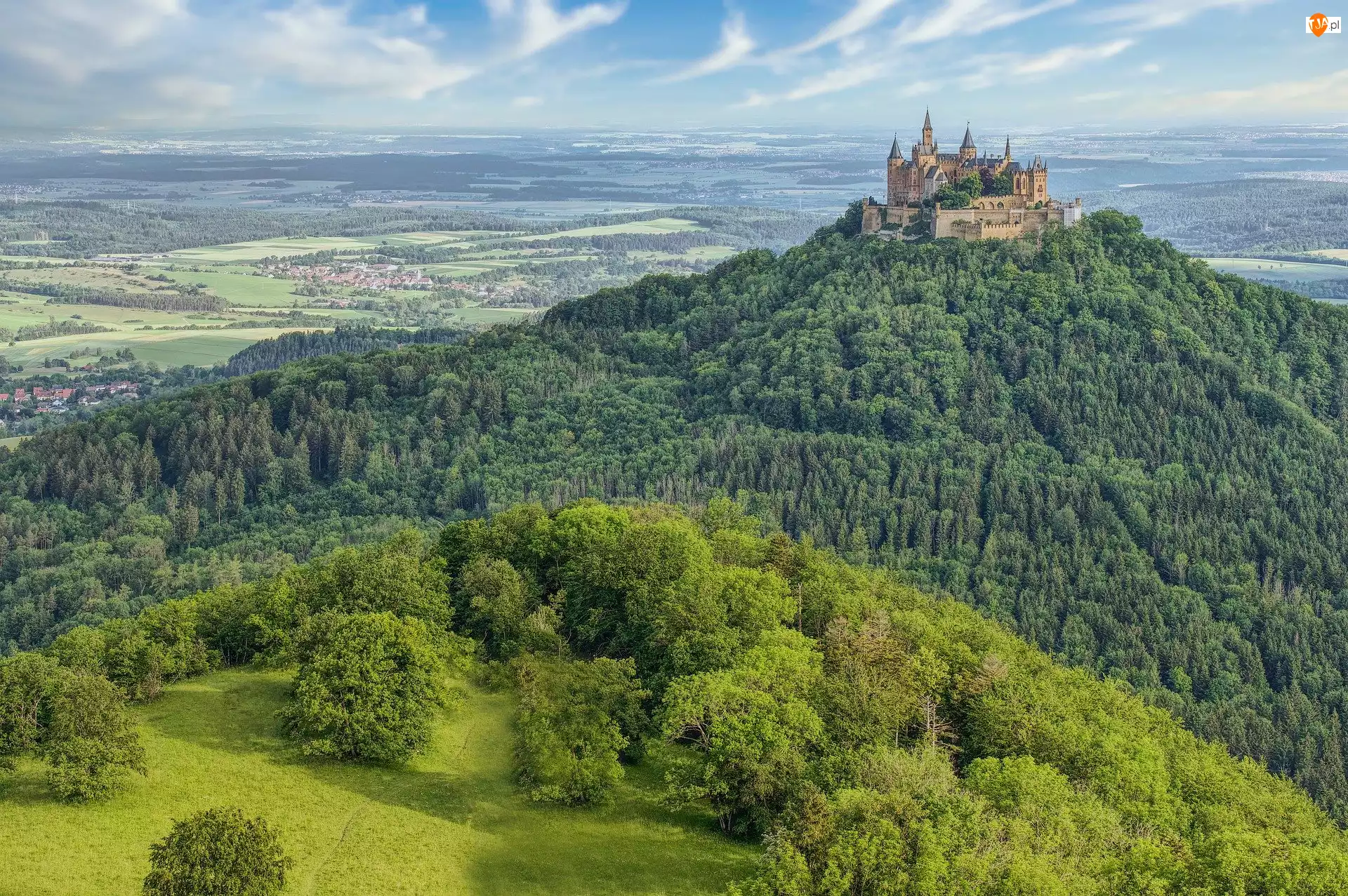 Góra Hohenzollern, Zamek Hohenzollern, Niemcy, Zalesiona, Badenia-Wirtembergia, Wzgórze, Drzewa
