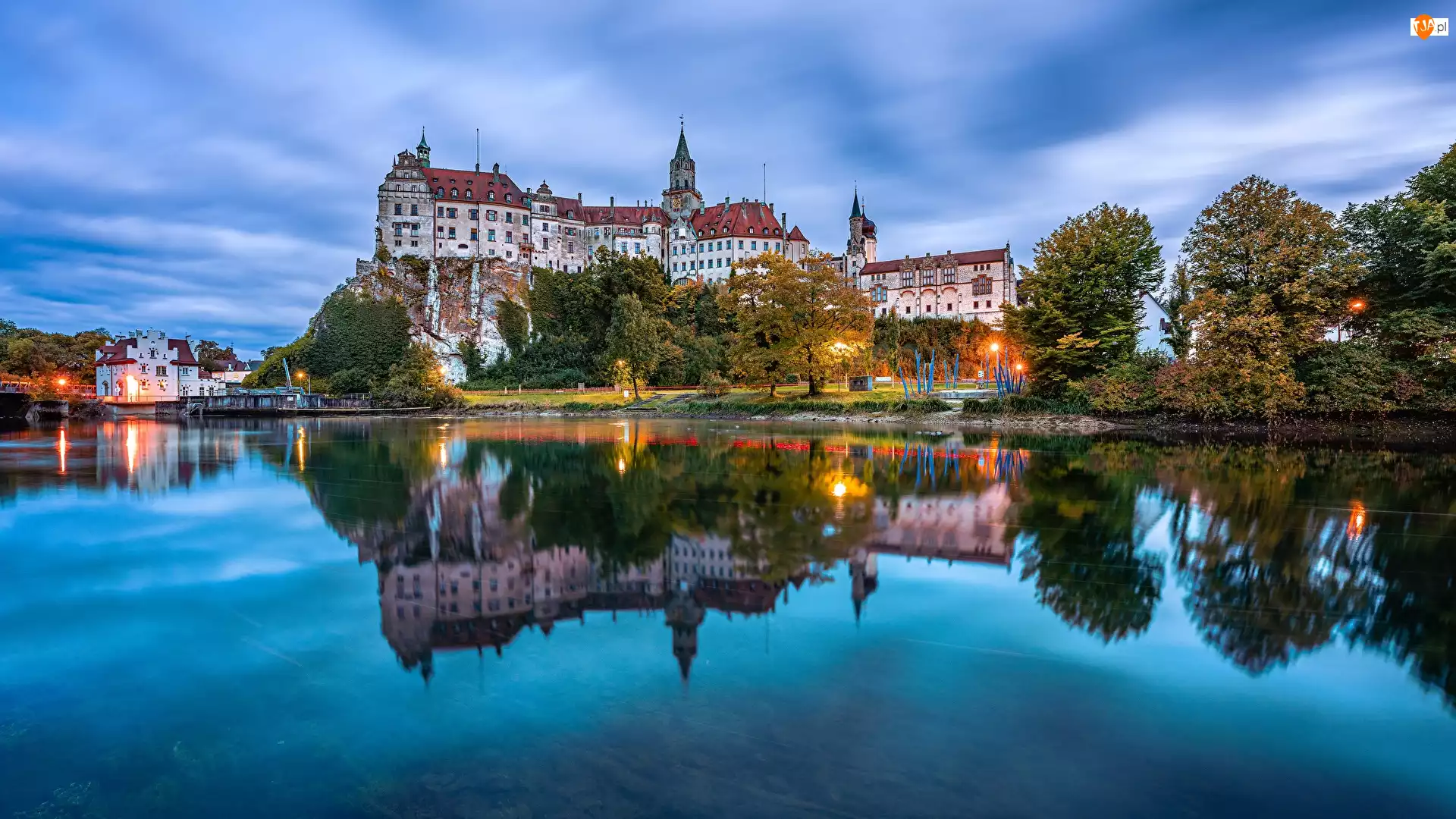 Rzeka Dunaj, Zamek Sigmaringen, Zachód słońca, Niemcy, Drzewa, Badenia-Wirtembergia