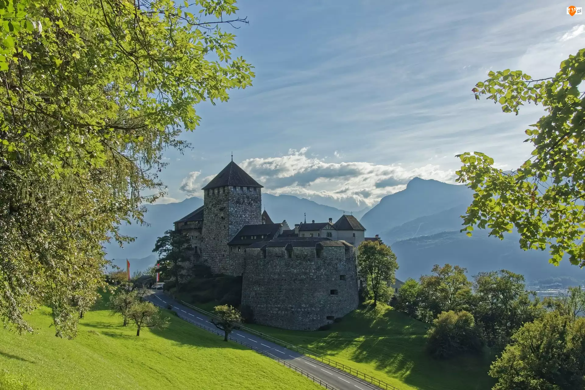 Liechtenstein, Vaduz, Góry, Księstwo, Drzewa, Droga, Zamek w Vaduz