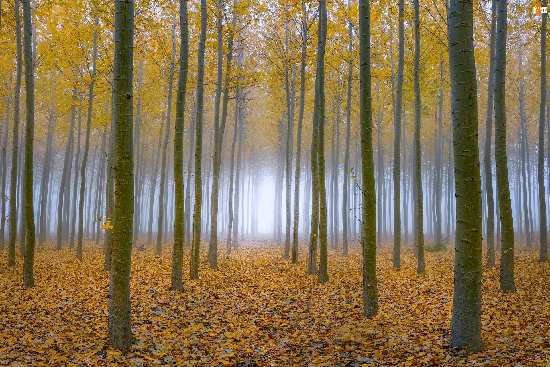 Drzewa, Las, Liście, Jesień, Topole osikowe, Mgła