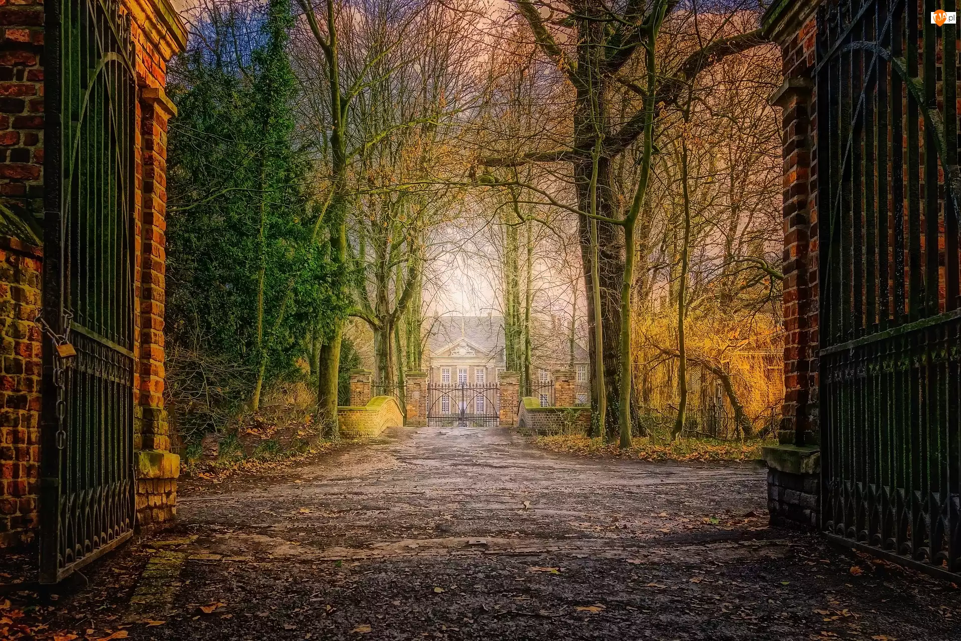 Park, Brama, Dom, Drzewa
