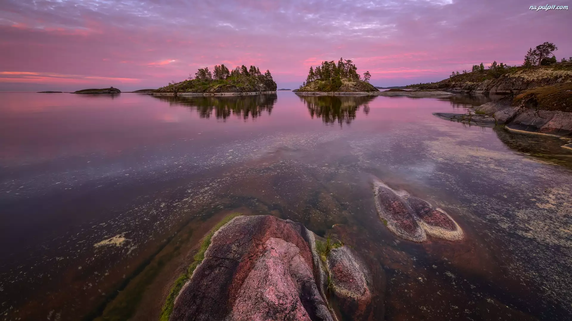 Jezioro Ładoga, Wysepki, Niebo, Rosja, Zaróżowione, Drzewa, Skały