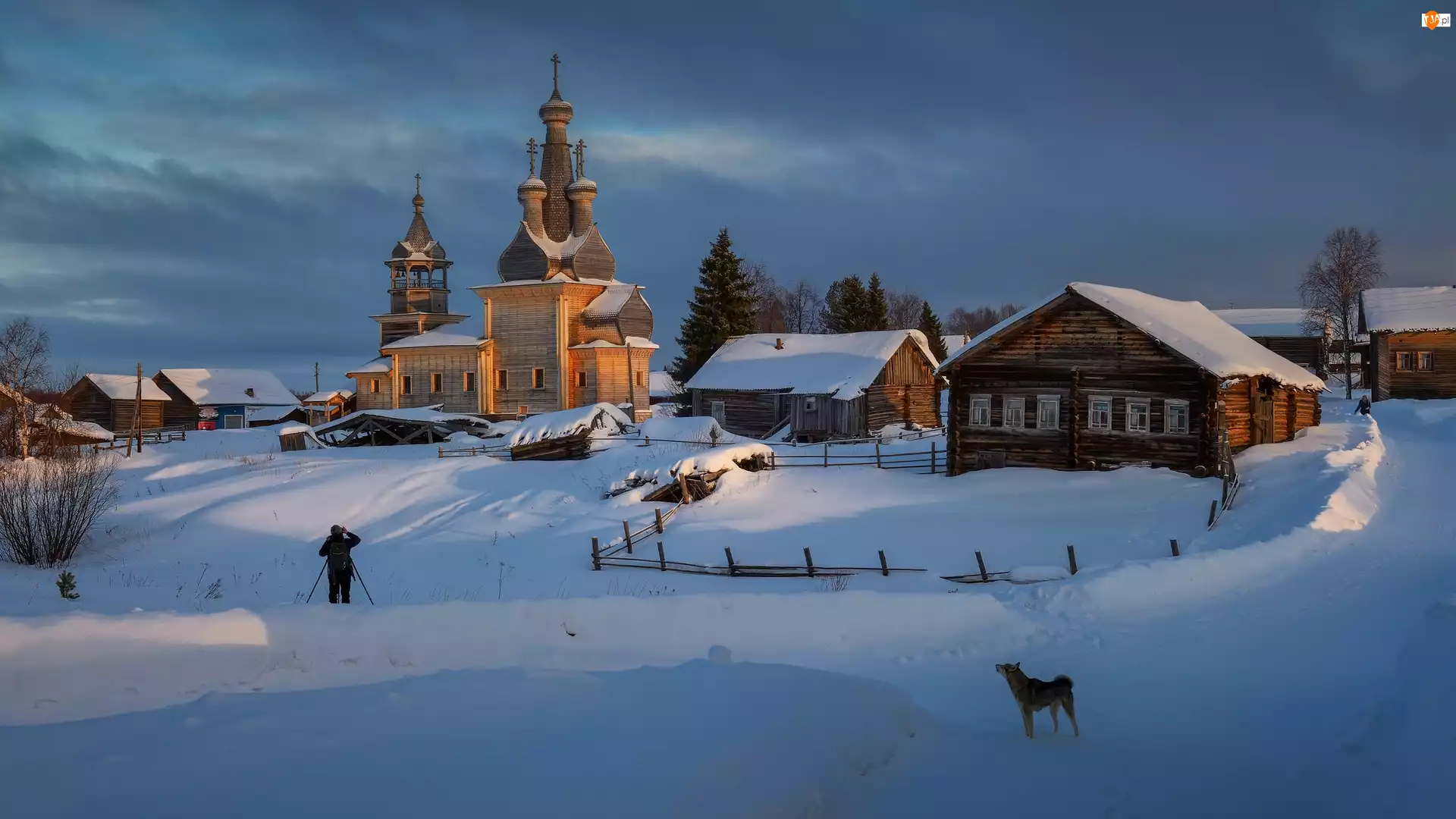 Drzewa, Rosja, Cerkiew, Zima, Obwód archangielski, Domy, Śnieg, Wieś Kimzha