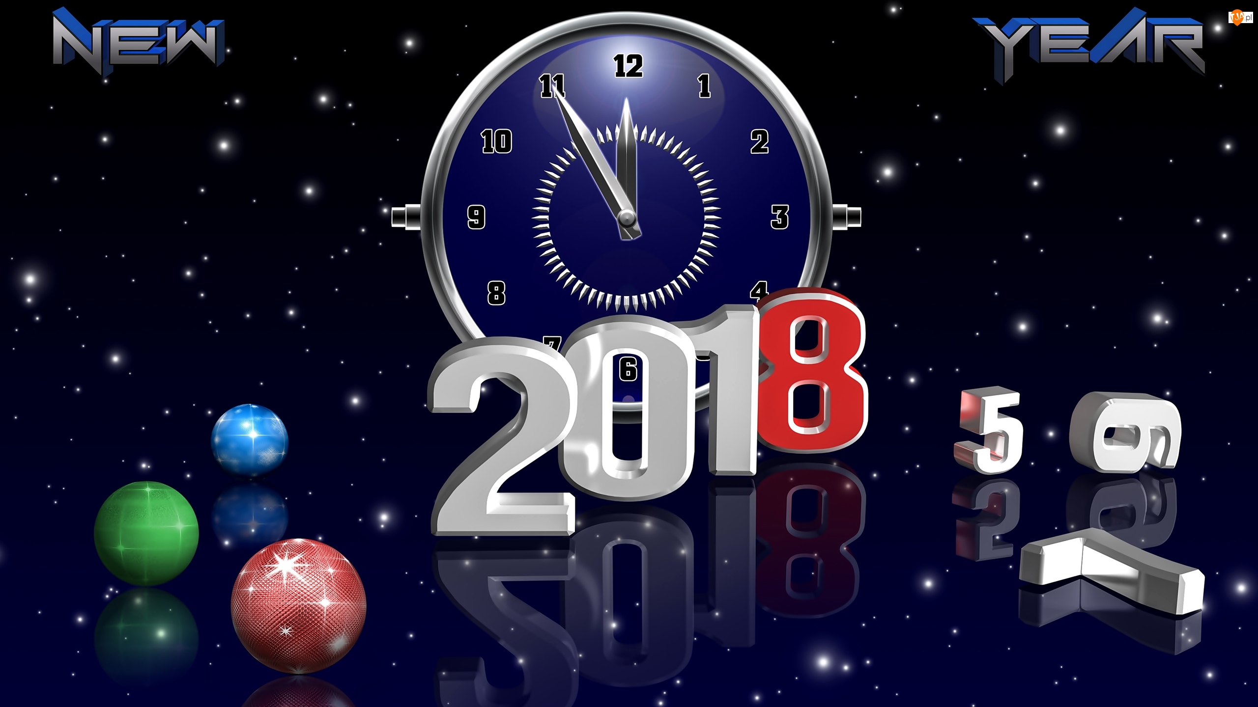 2018, Nowy Rok, Zegar, Odbicie, Grafika 2D, Bombki