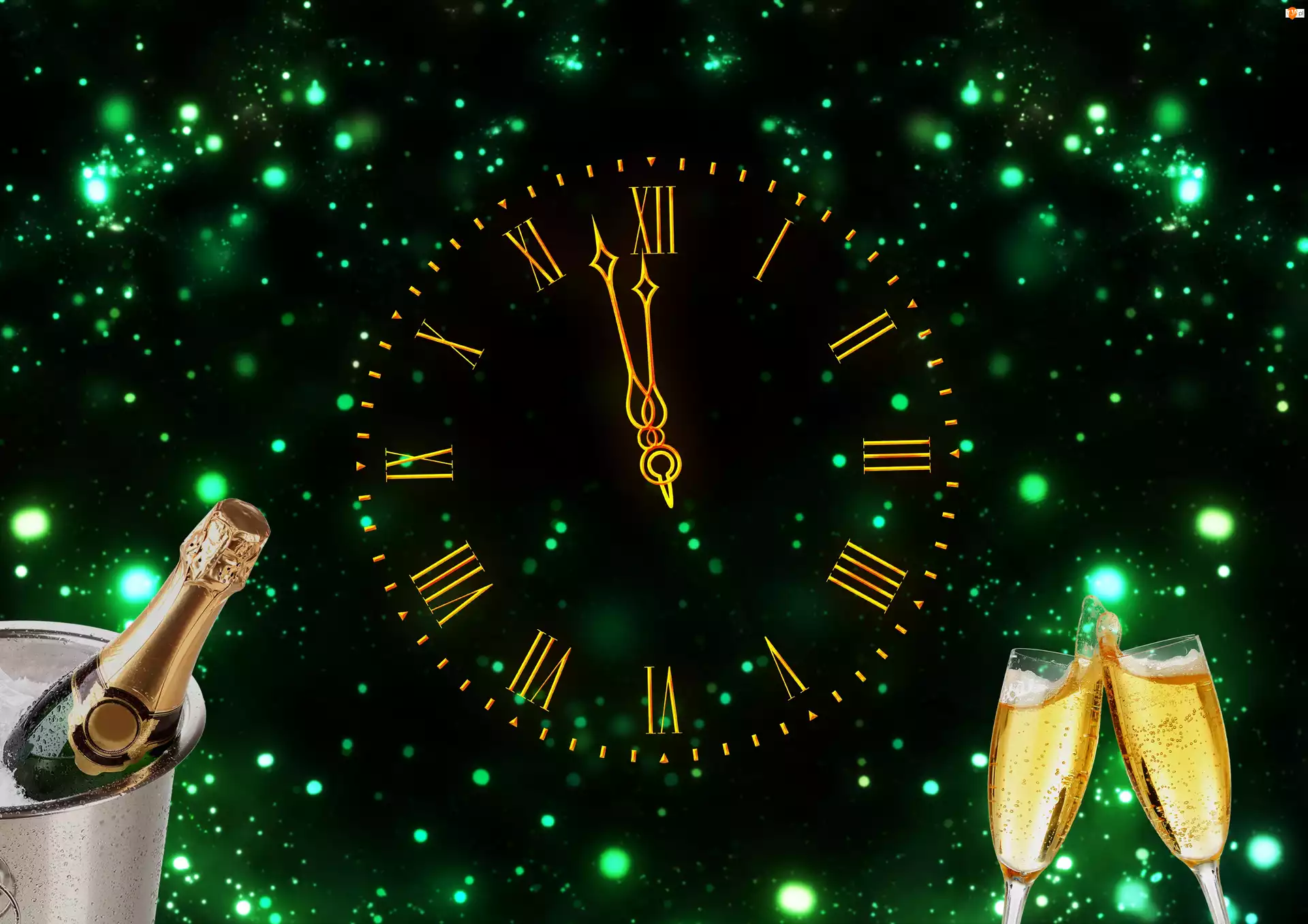 Szampan, Kieliszki, Zegar, Nowy Rok, Dwa
