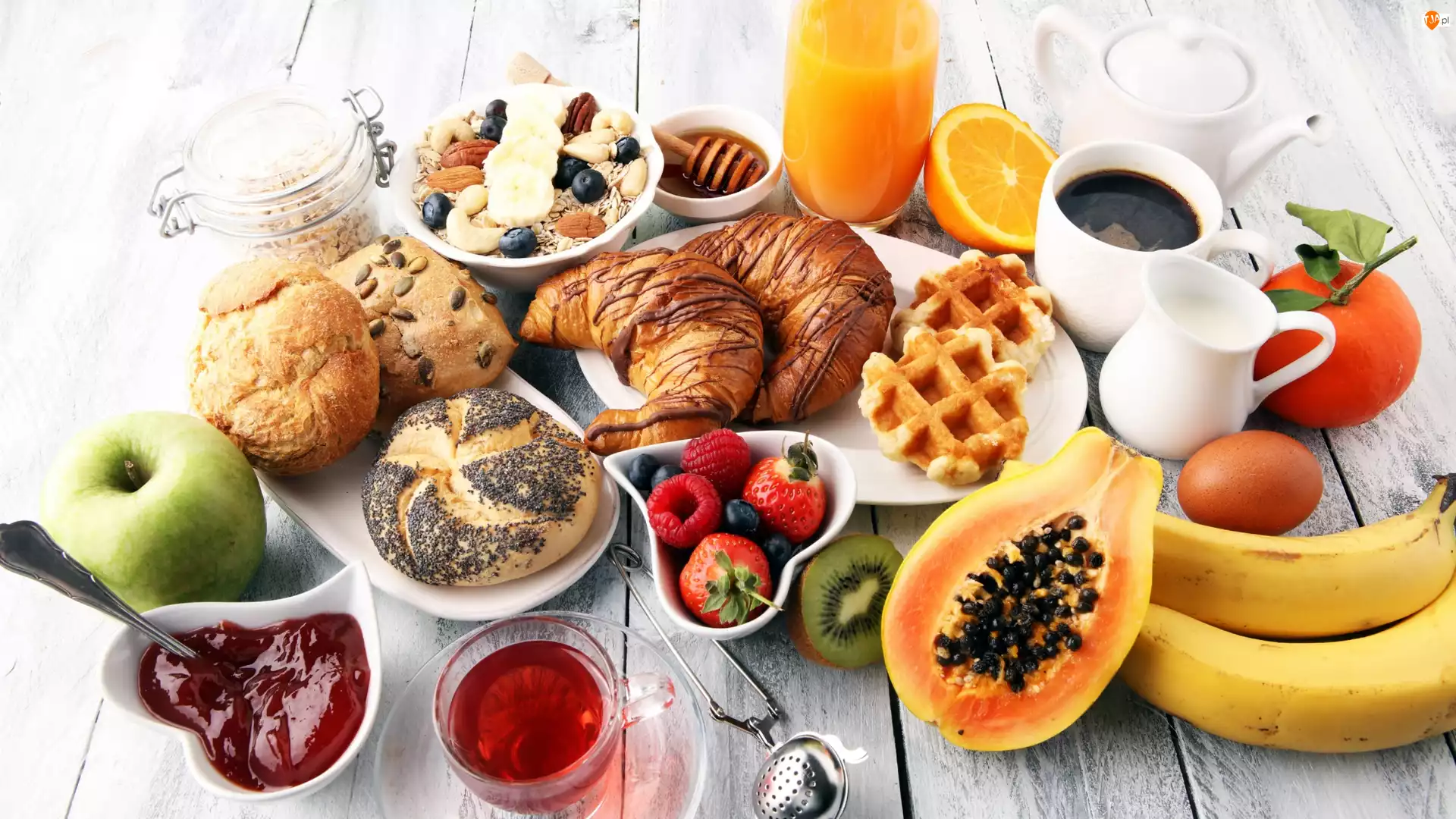 Kawa, Sok, Rogale, Śniadanie, Bułki, Dżem, Owoce