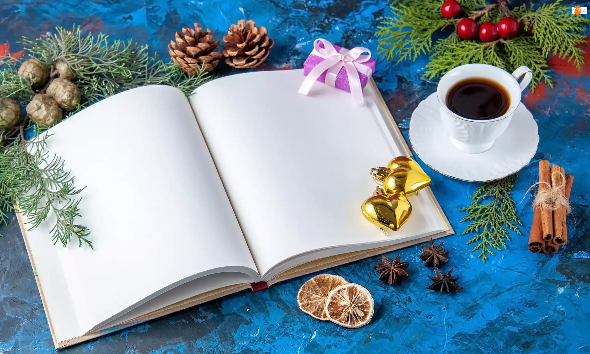 Zeszyt, Kompozycja, Filiżanka, Prezent, Gałązki, Cynamon