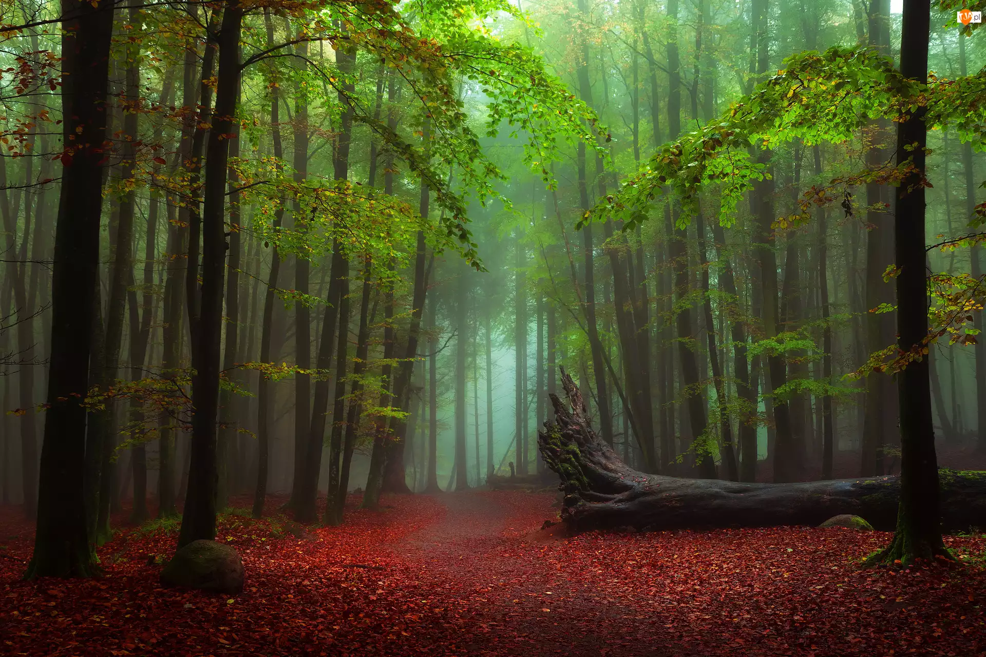 Zielone, Drzewa, Drzewo, Las, Powalone, Mgła, Dro