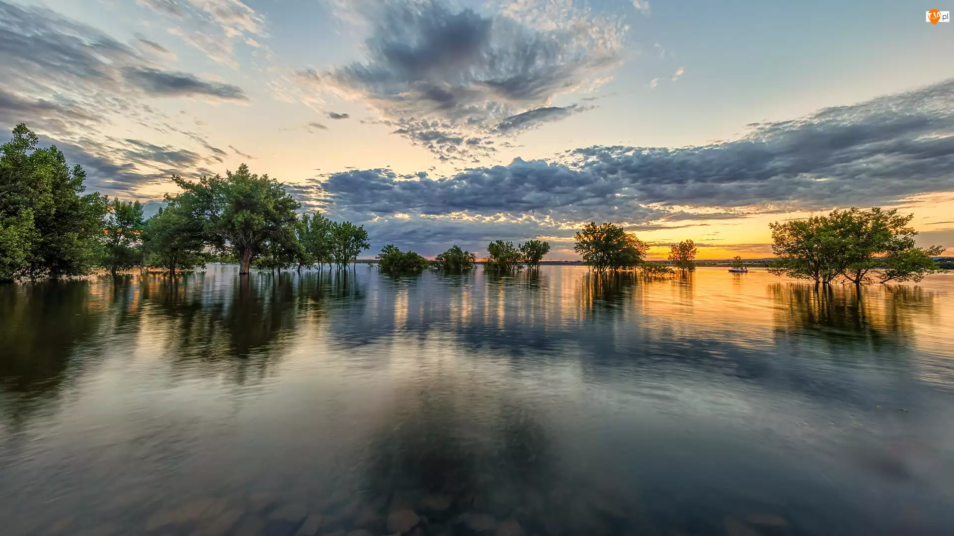 Chatfield Lake, Stany Zjednoczone, Chatfield State Park, Łódka, Kolorado, Jezioro, Drzewa, Park stanowy
