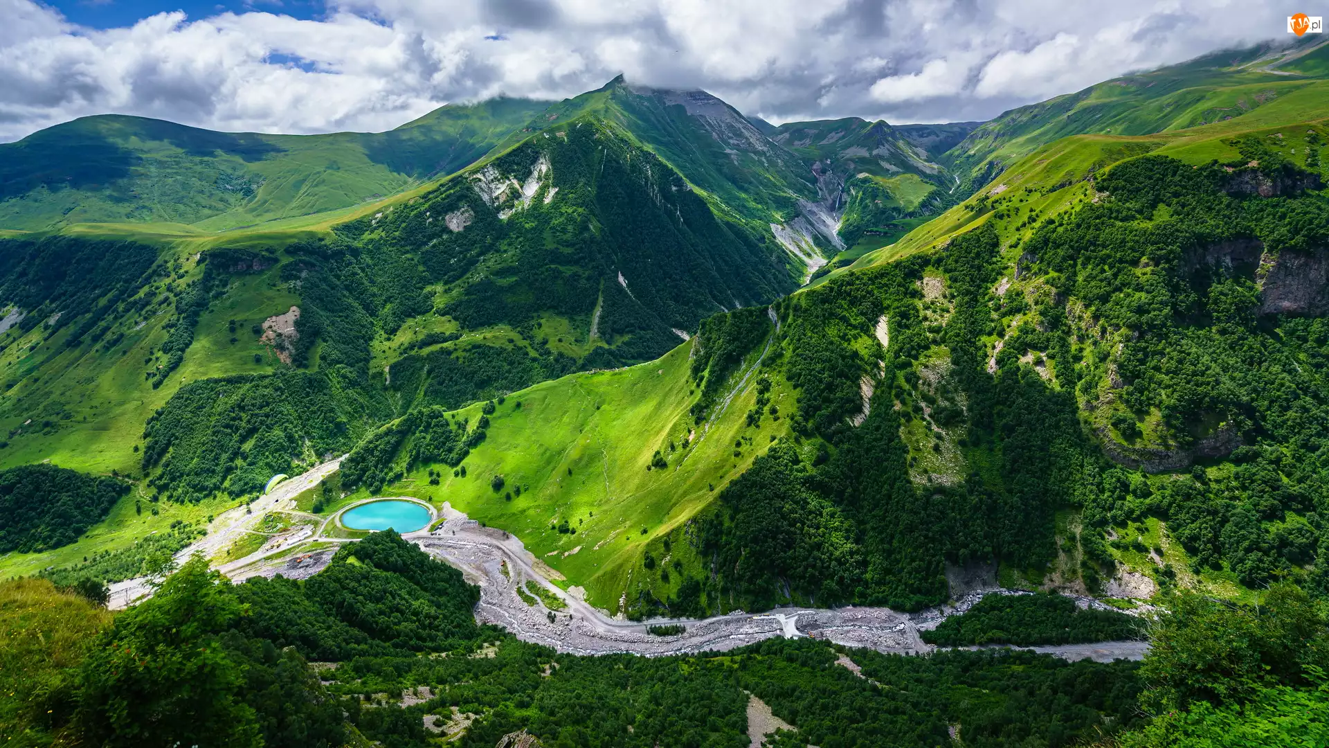 Rzeka Aragwi, Kaukaz, Jezioro, Gruzja, Gudauri, Góry, Lasy, Droga, Zielone, Szlak handlowy, Gruzińska Droga Wojenna, Mccheta-Mtianetia