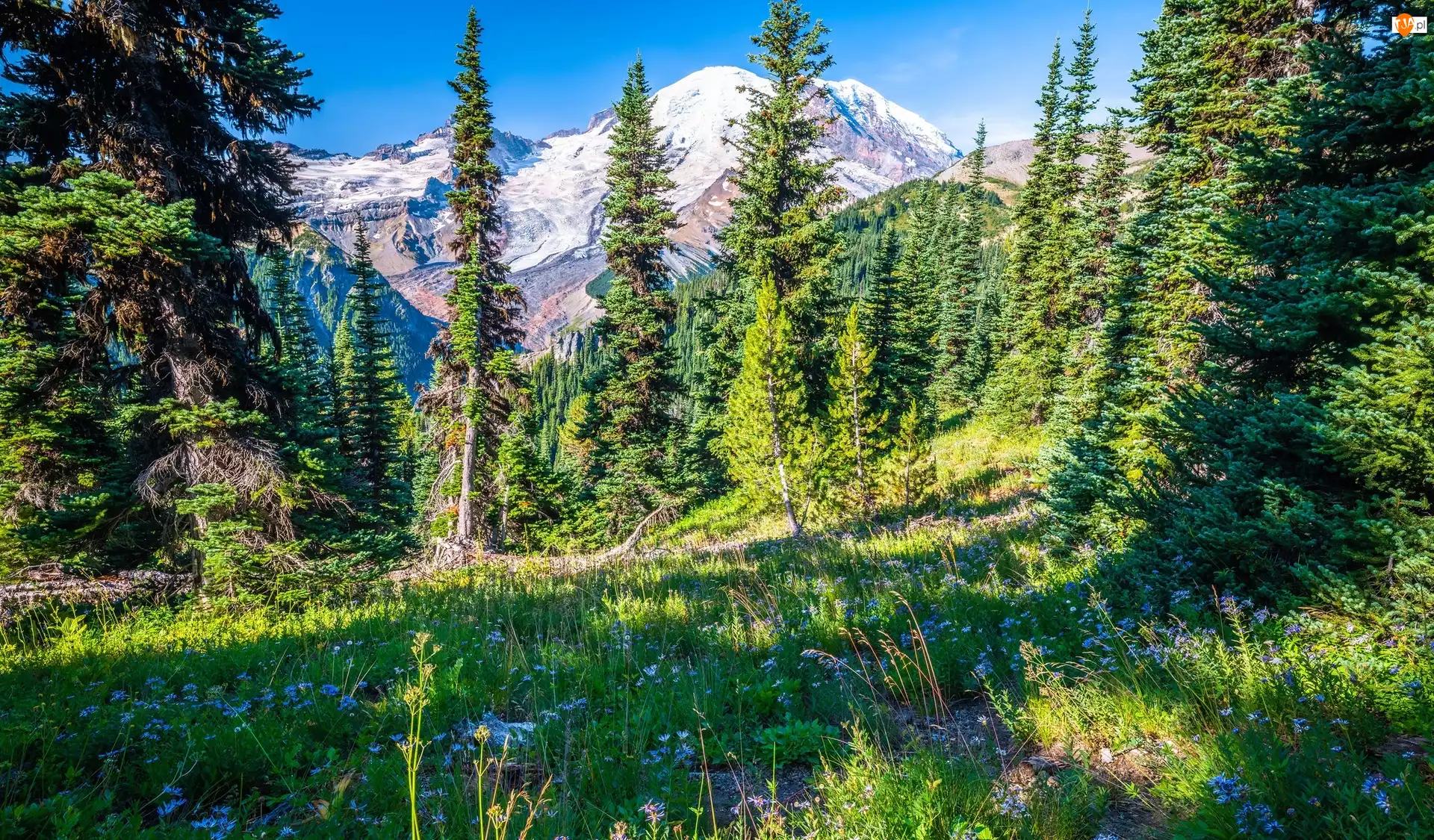 Zielone, Kwiaty, Drzewa, Góry, Świerki