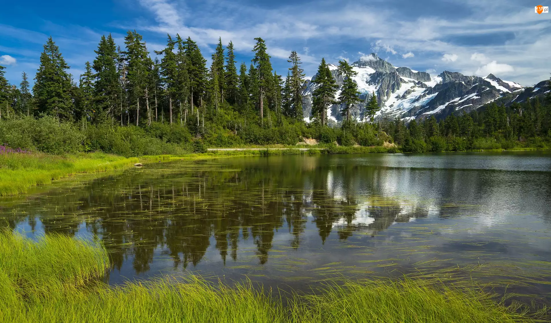 Zielone, Trawa, Jezioro, Góry, Drzewa