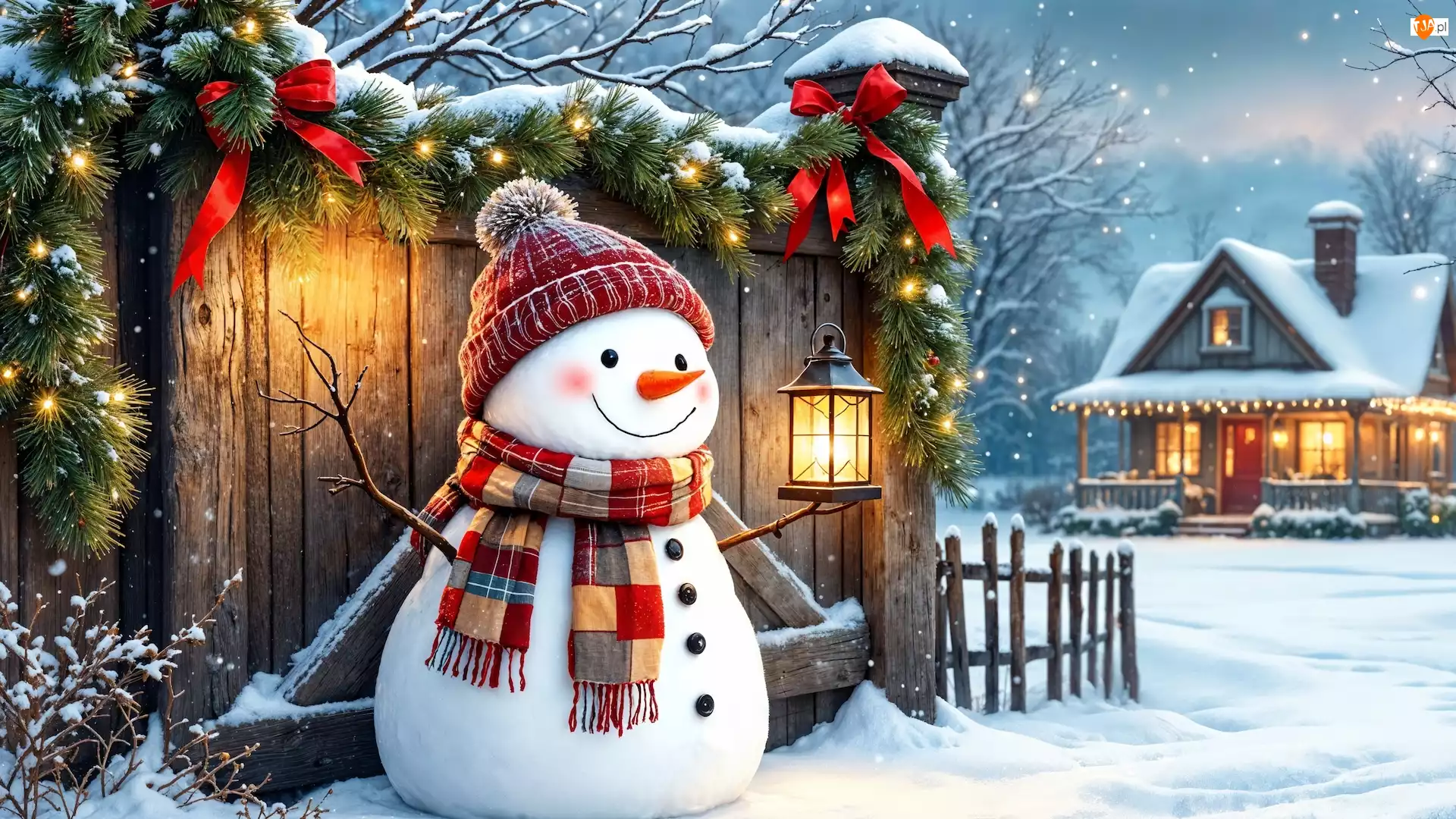 Zima, Bałwanek, Lampion, Płot, Dom, Udekorowany