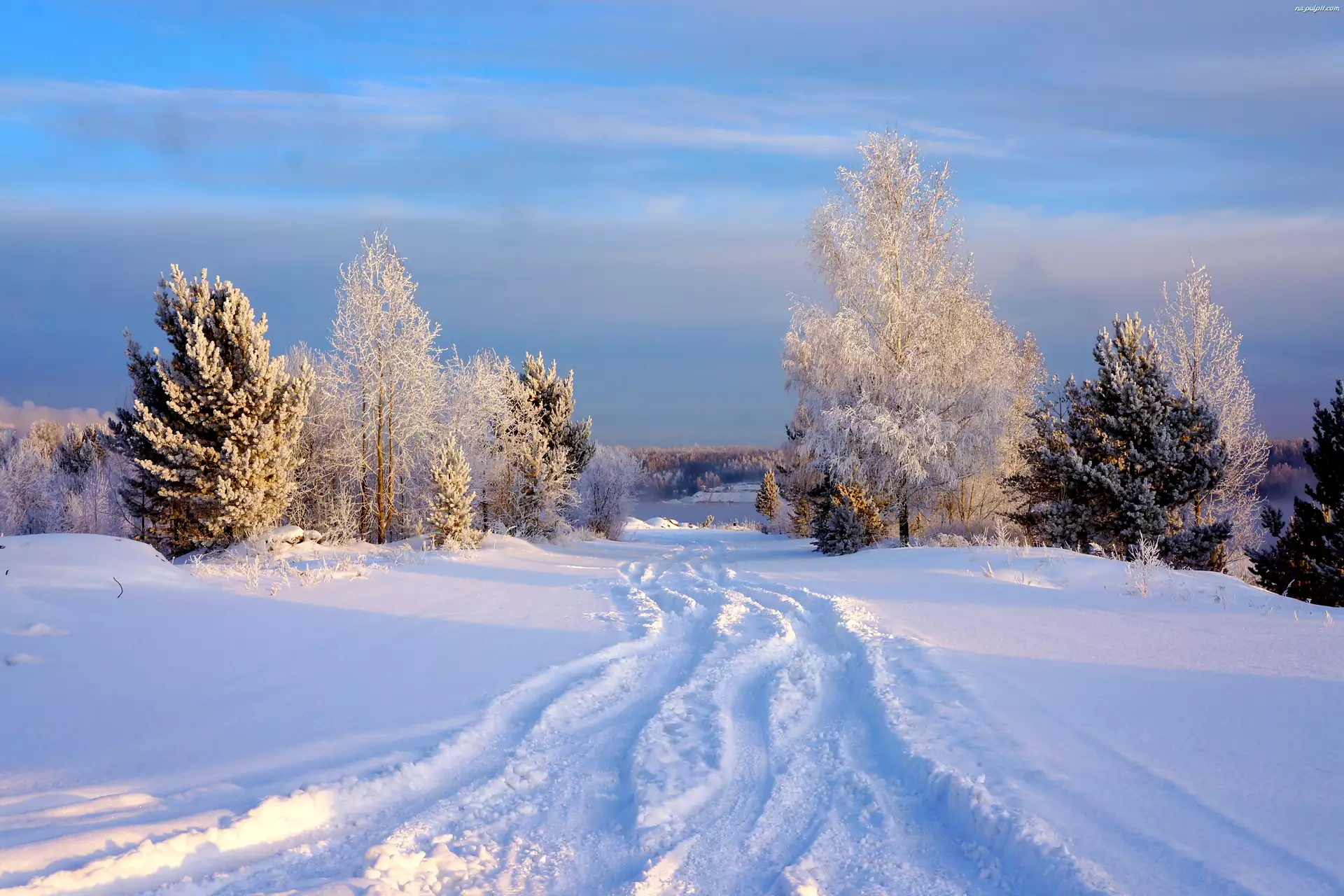 Zima, Droga, Rzeka, Drzewa, Lasy