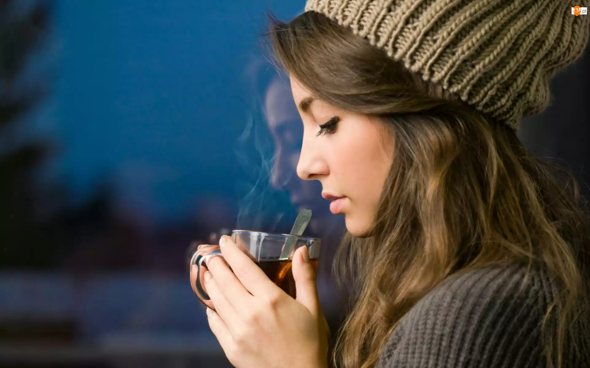Zima, Dziewczyna, Herbata, Gorąca, Okno