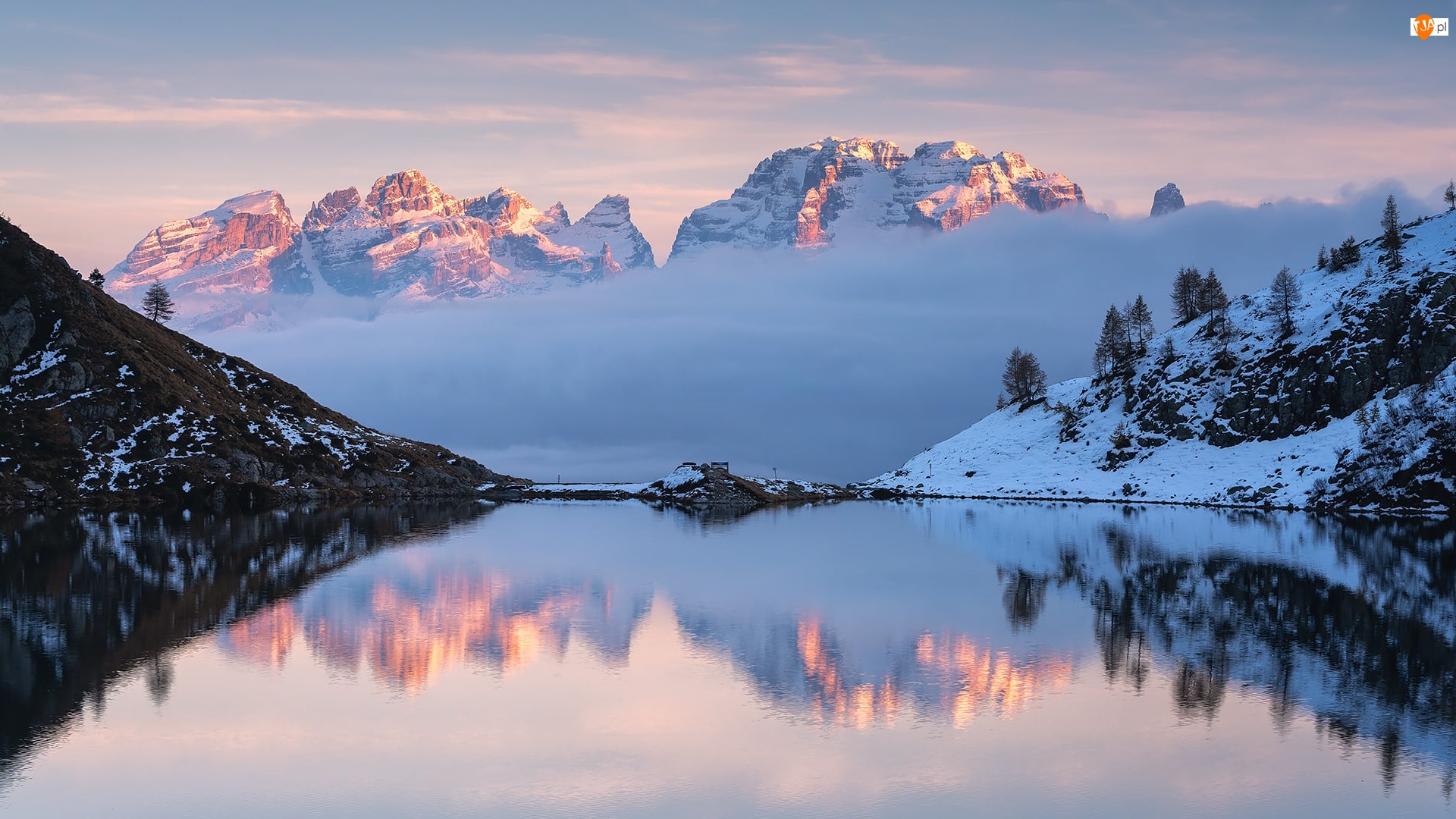 Zima, Góry, Drzewa, Odbicie, Jezioro, Mgła