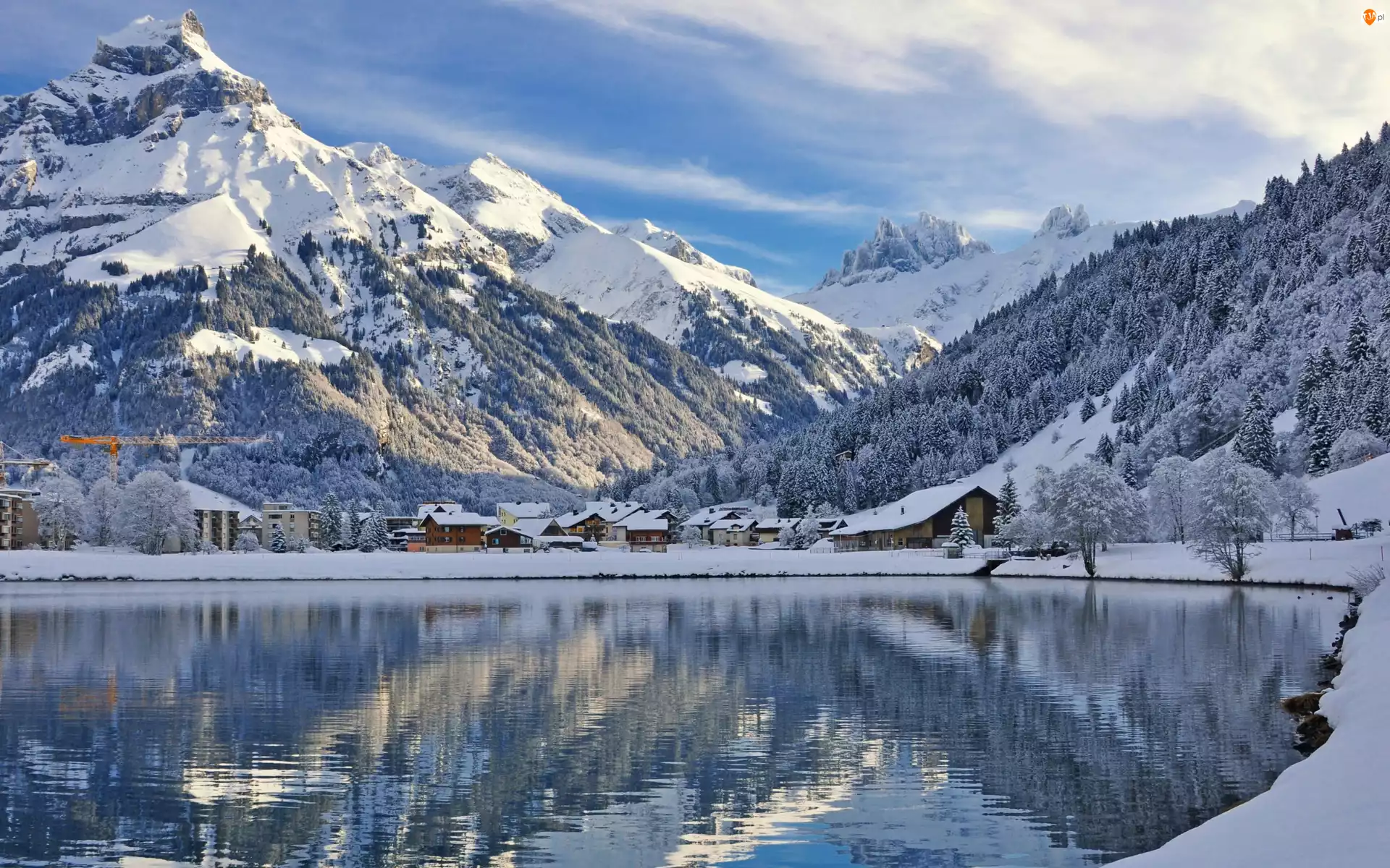 Zima, Góry, Jezioro, Las, Zabudowania