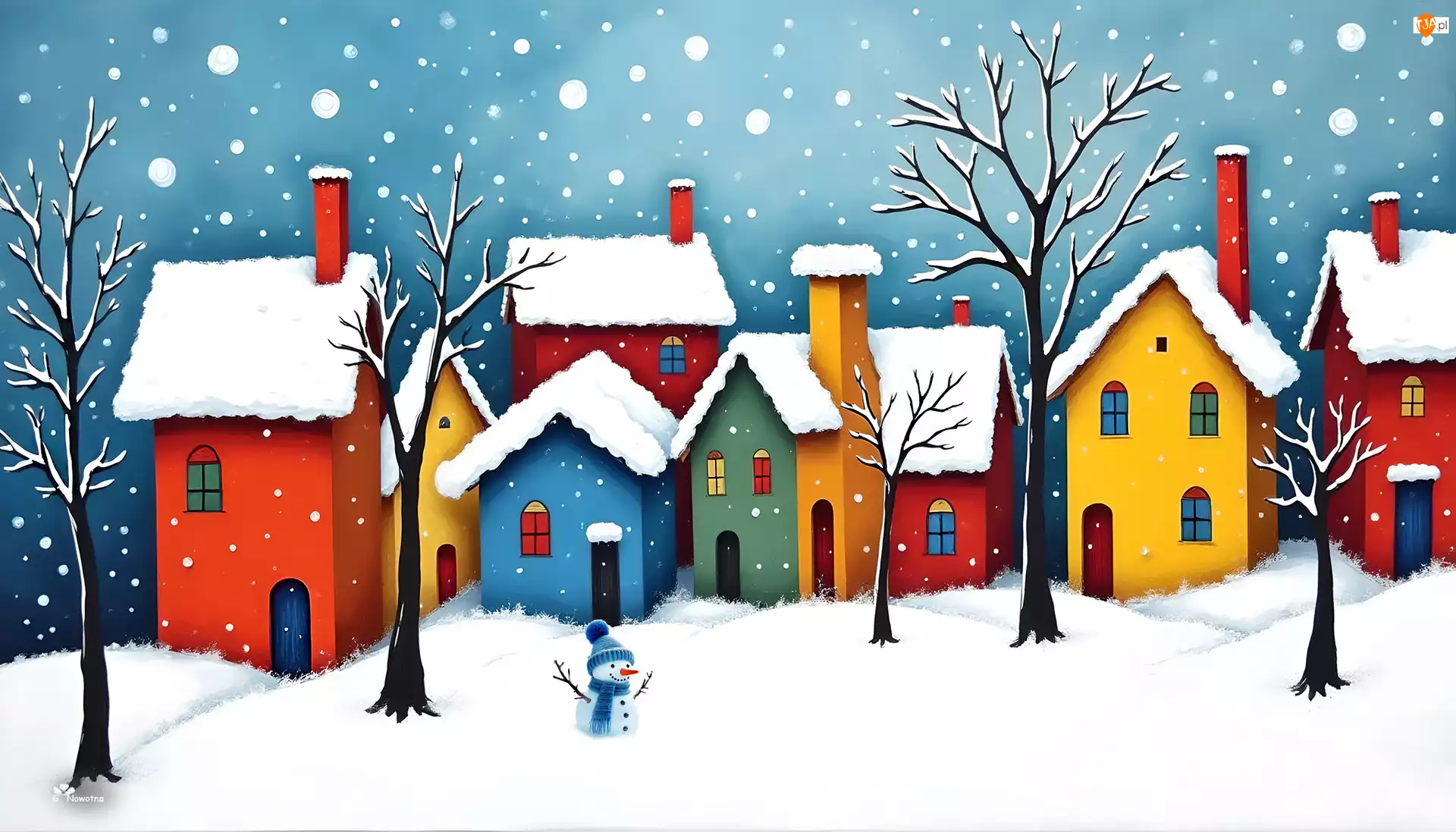 Zima, Grafika, Domy, Kolorowe, Bałwan