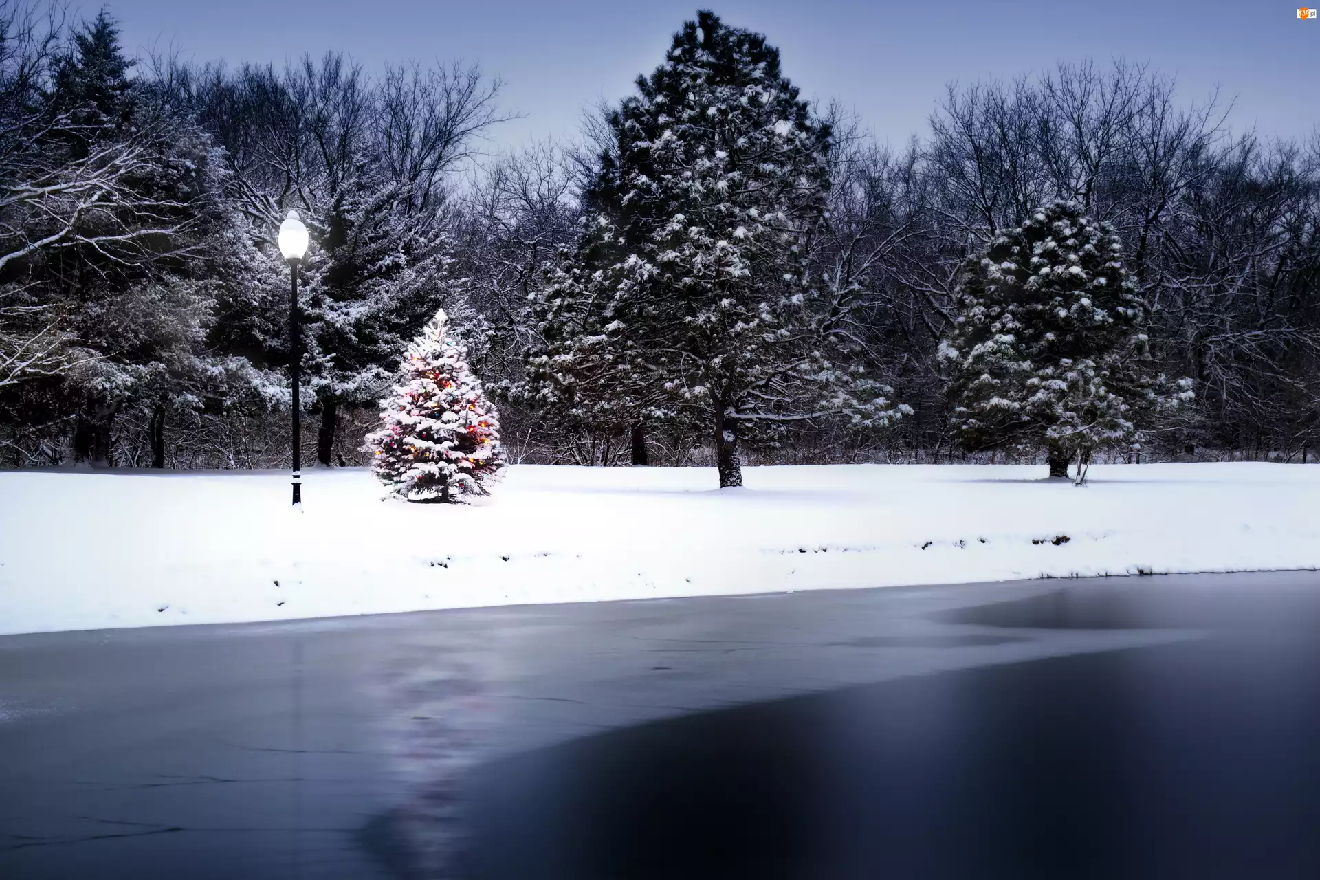Jezioro, Zima, Choinka, Zamarznięte