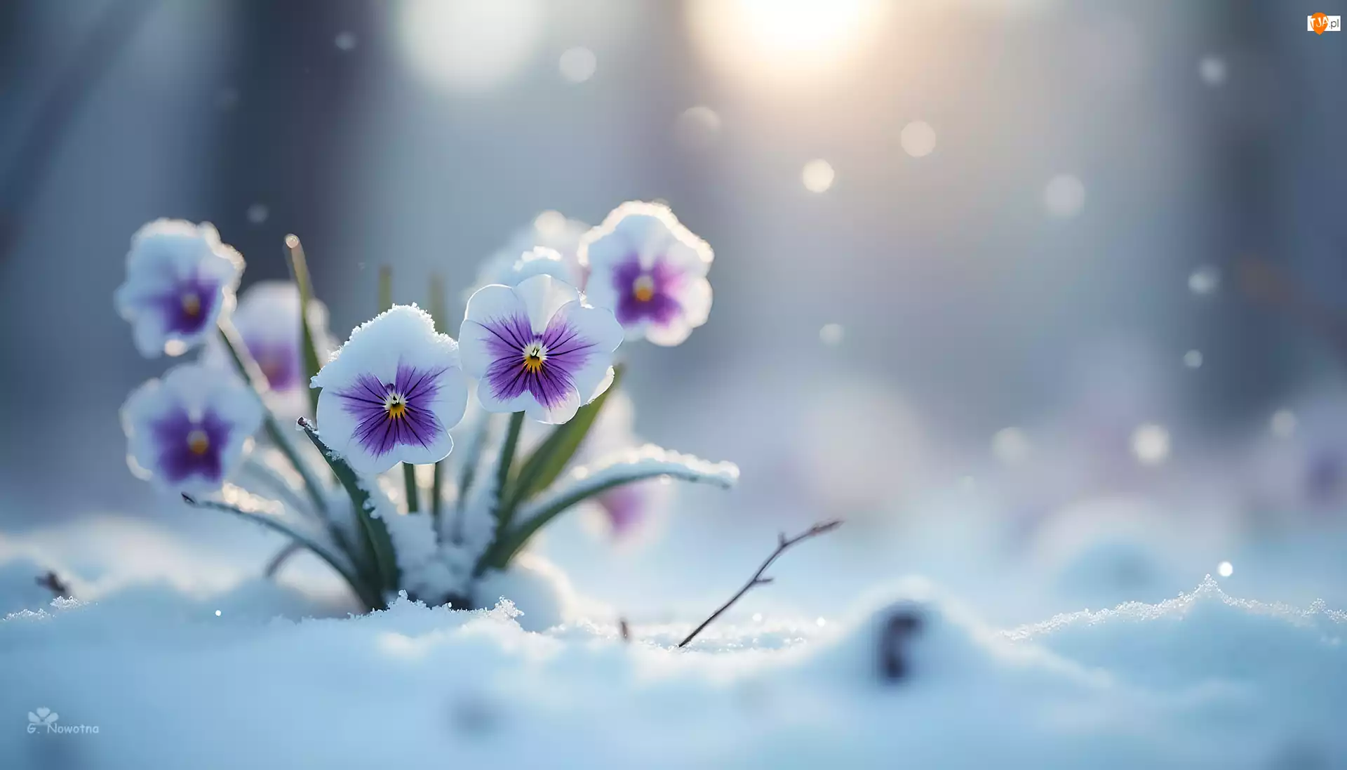 Zima, Kwiaty, Śnieg, Bratki, Grafika