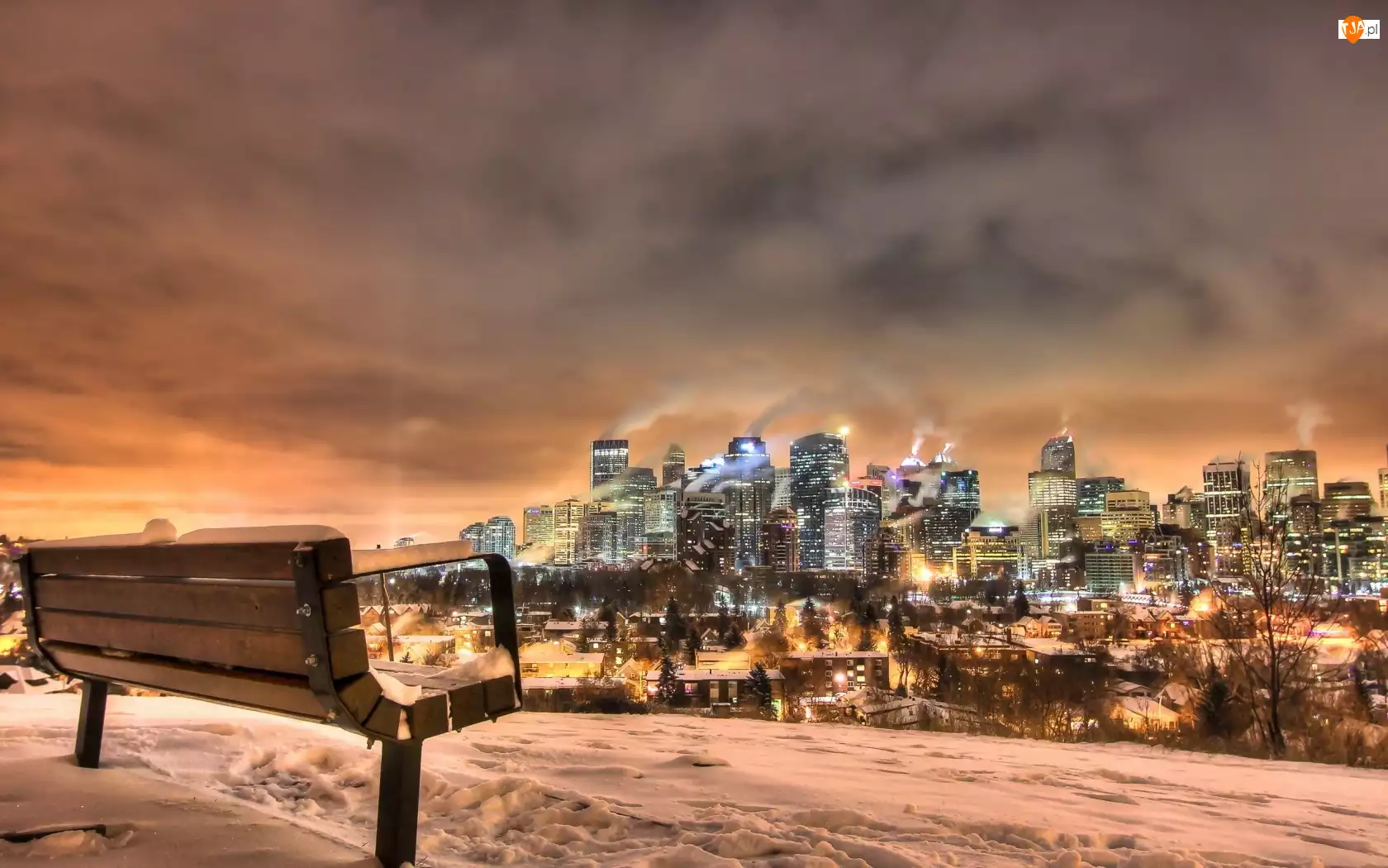 Zima, Miasto, Śnieg, Nocą, Ławka