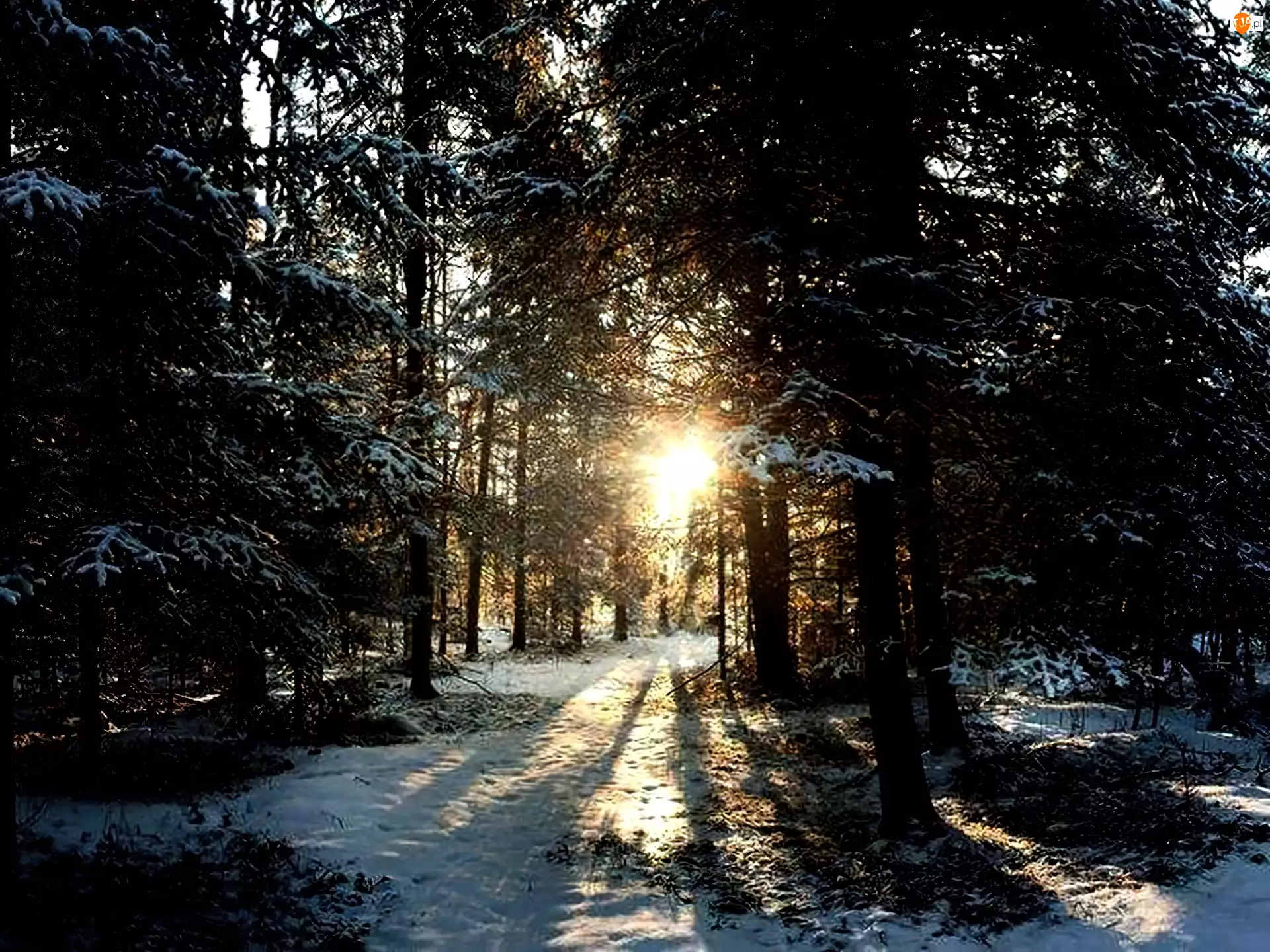 Przebijające Słońce, Zima, Las, Droga