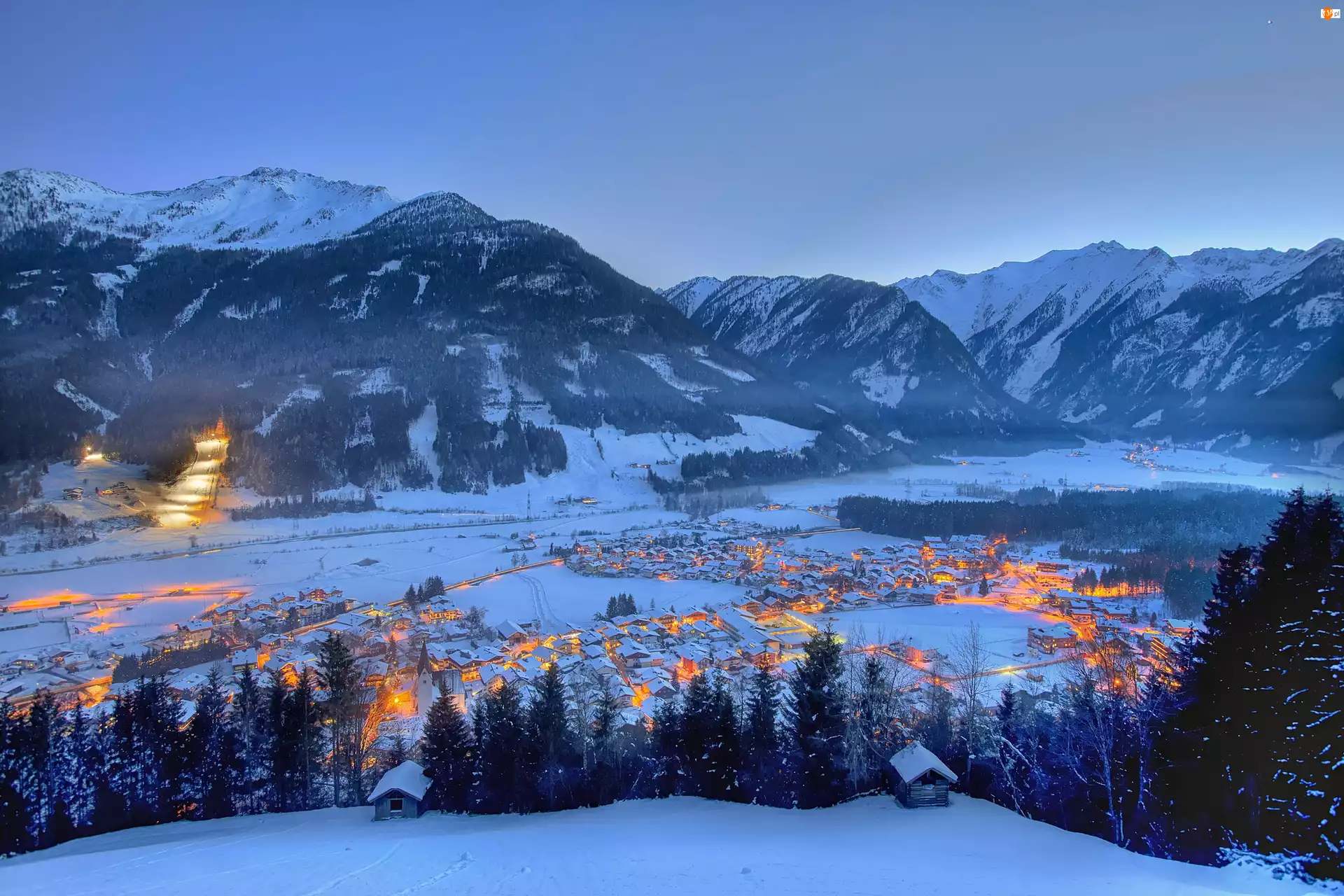 Zima, Wioska, Śnieg, Góry